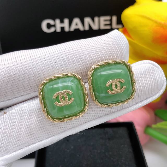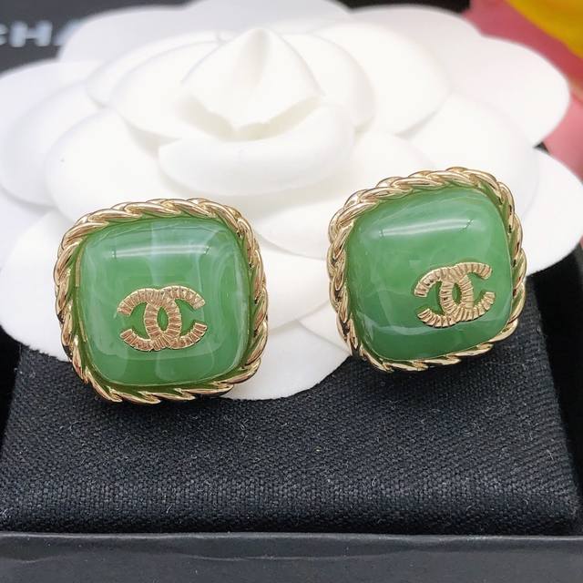 Chanel square double C green earrings same material 925 silver needle high quality