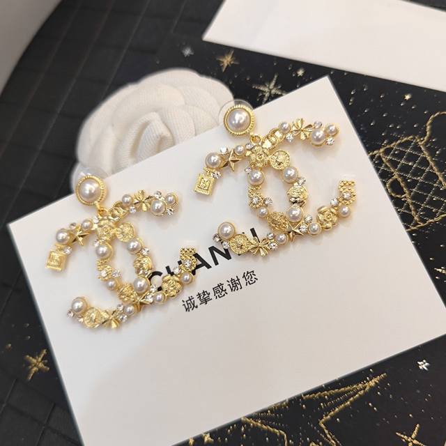 Chanel earrings are hot-selling and new Chan 25 carved gold double C pearl earr