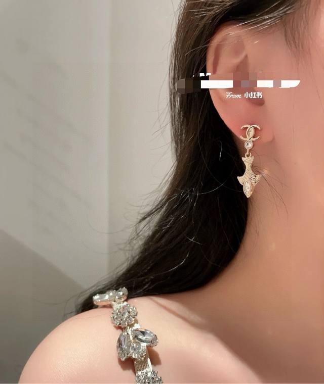Today's New Arrival: Chanel Pearl Shell Earrings (25C) with Full Diamond Double C Pendant. The design of the small golden scallop shell is dreamy and cute, evoking a sense of being in an underwater world, full of girlish charm. The slightly oversized size is very eye-catching. Made of brass with Swarovski crystals, identical to the original, offering excellent value. Ocean-themed earrings.