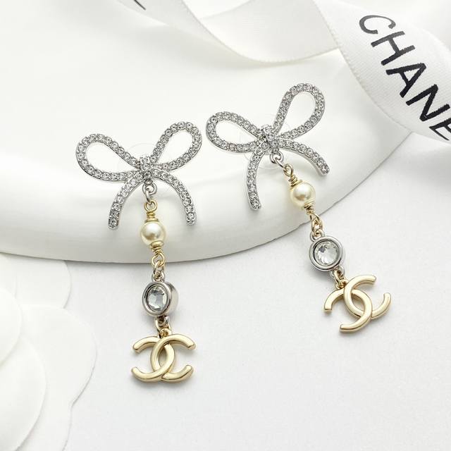 Chanel 25 silver rhinestone bow tassel earrings