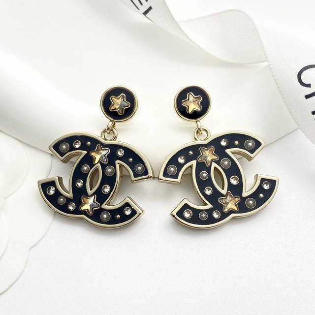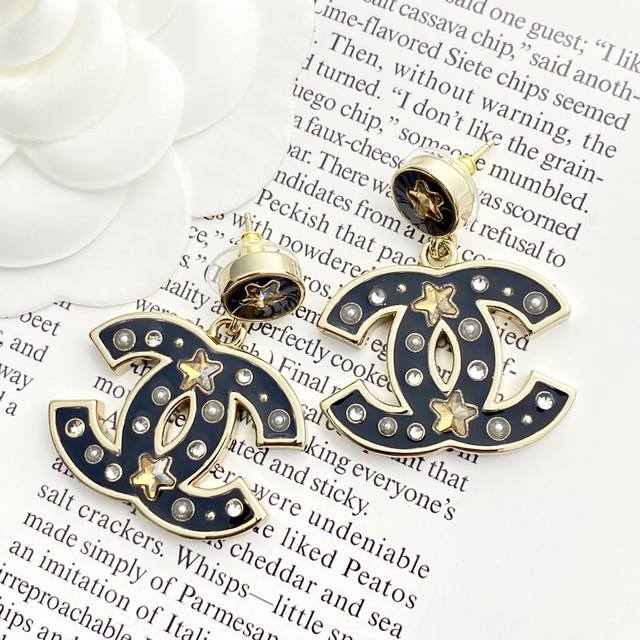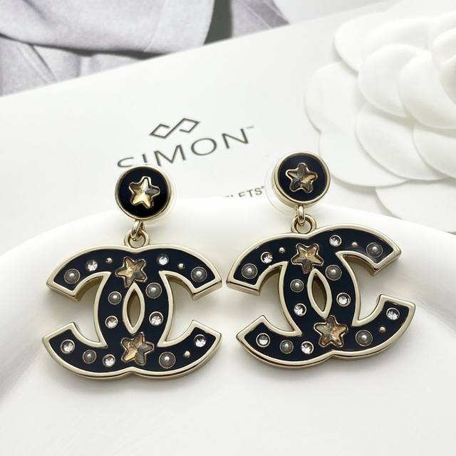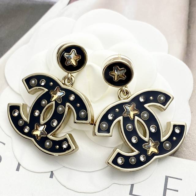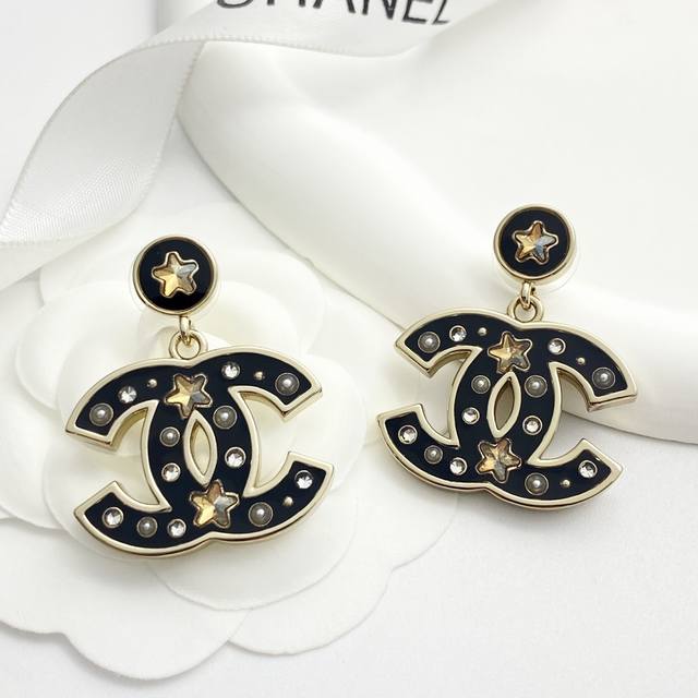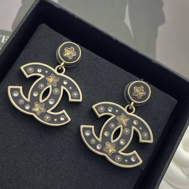 Black enamel double C with inlaid pearls, rhinestones, laser stars and other elements