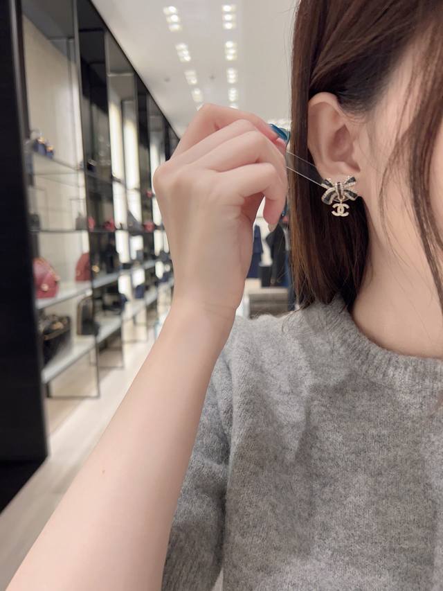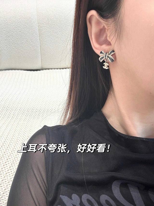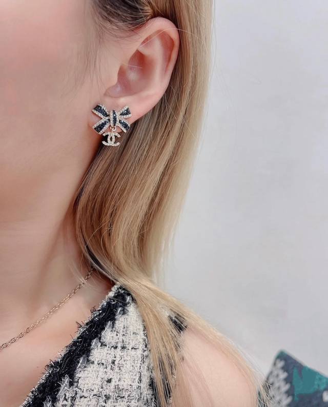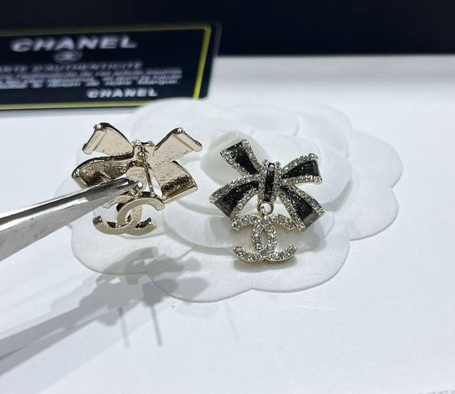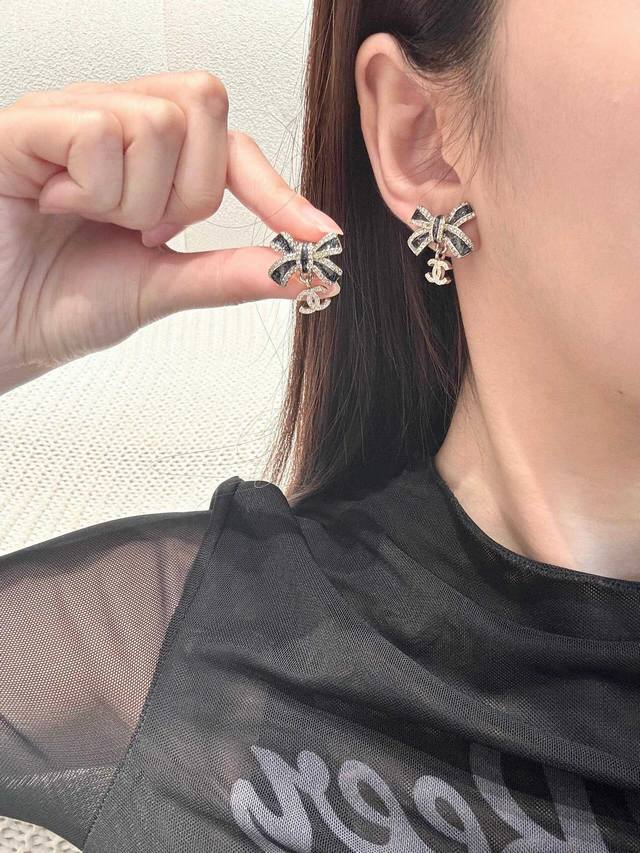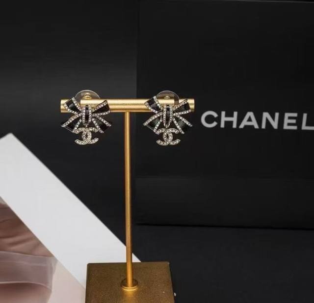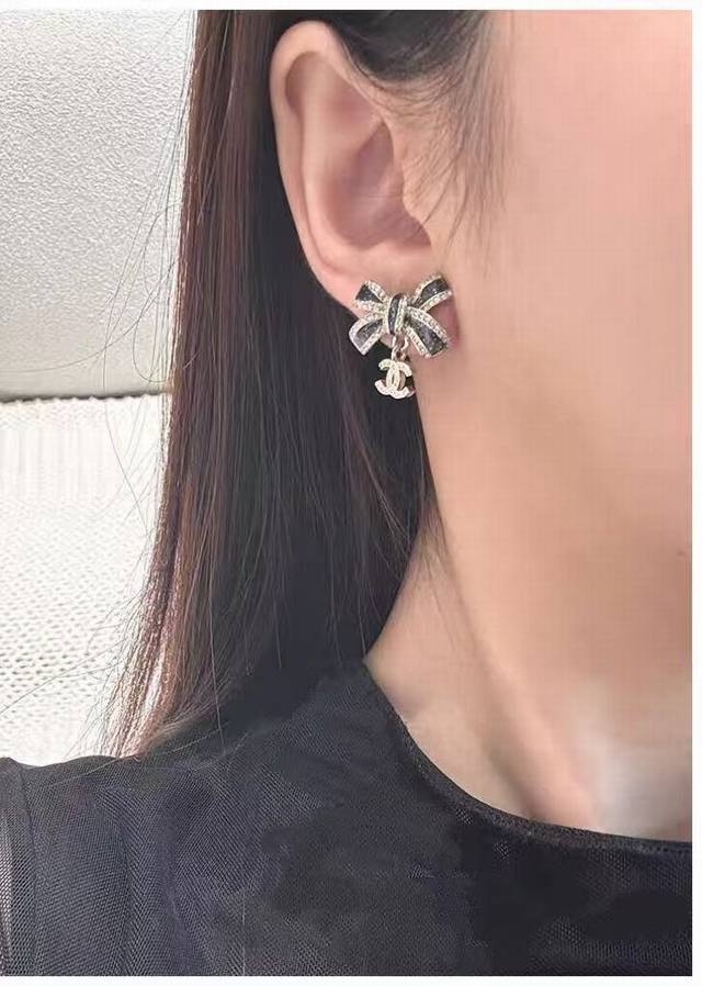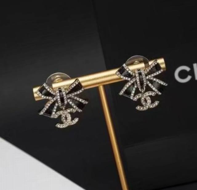 Today's New Chanel Earrings - Hot Selling Arrival! Chanel 25 Black and Gold Bow Double C Letter Earrings. Enamel bow, light gold, full diamond small double C pendant. The black part is embellished with fine shimmer, and the three-dimensional drip design is very textured! The edge of the butterfly is also surrounded by rhinestones! The black and gold color scheme exudes luxury, while the small double C embellishment adds a touch of gentleness. Elegant and sophisticated!