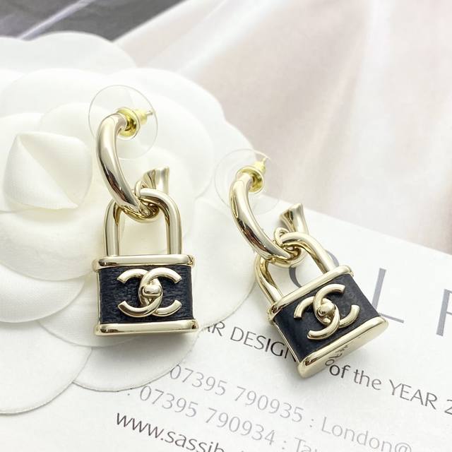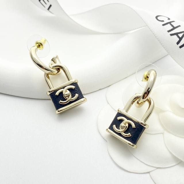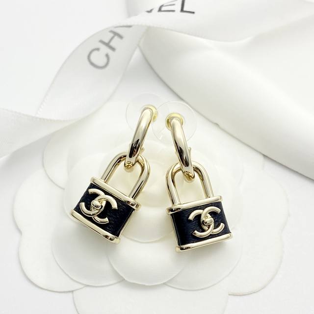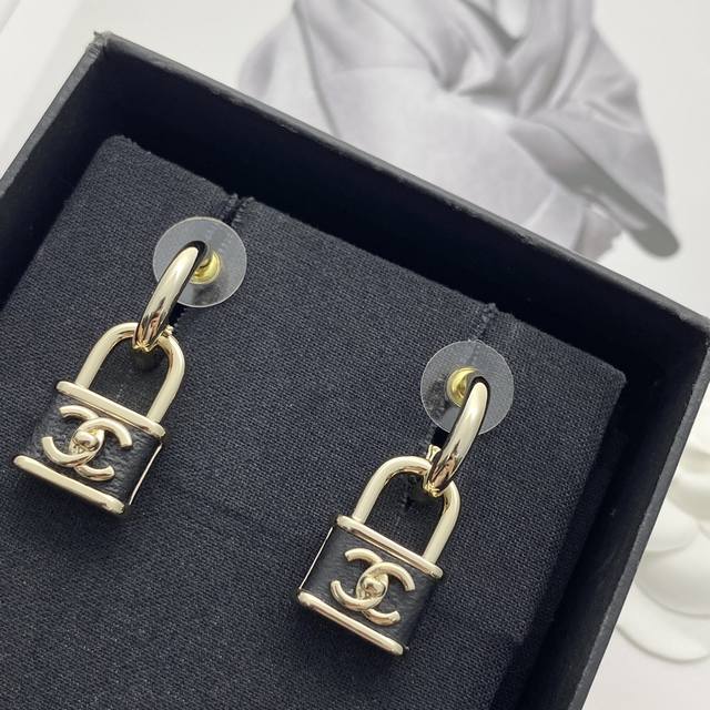 Chanel's bestselling earrings are now available! Chan 25 black and gold lambskin small lock earrings.