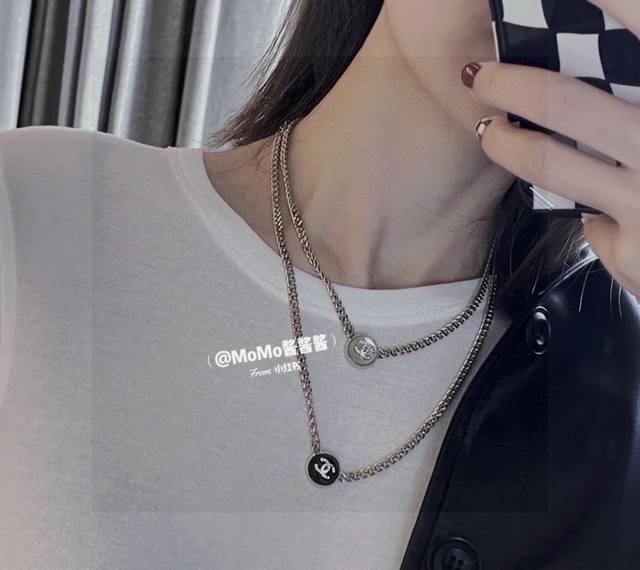 Chanel Double C Button Necklace. The double C logo is very delicate, and with the addition of Swarovski crystals, it's super sparkly and perfect for various everyday outfits! Necklace