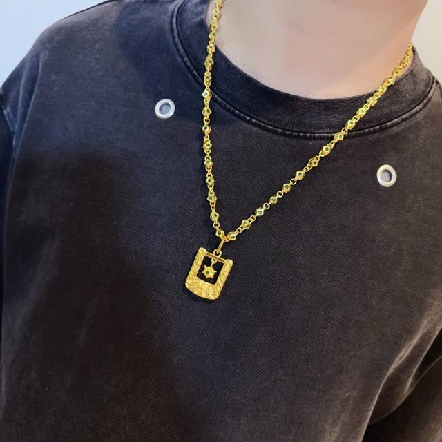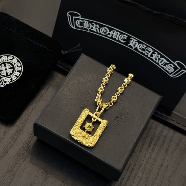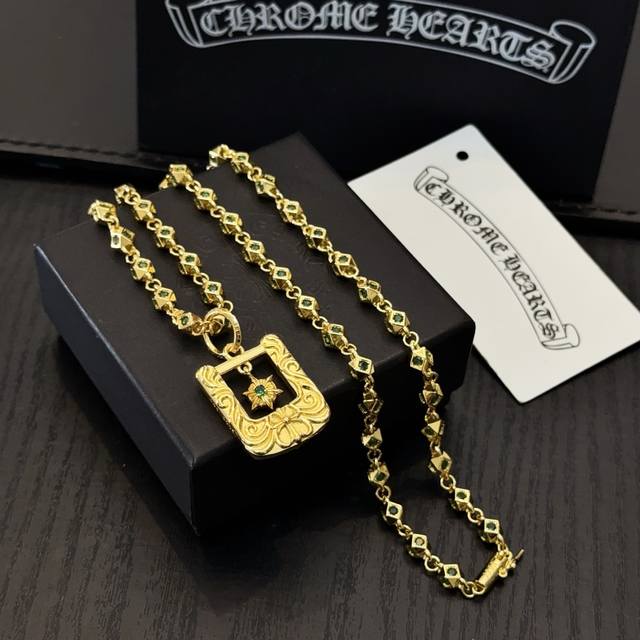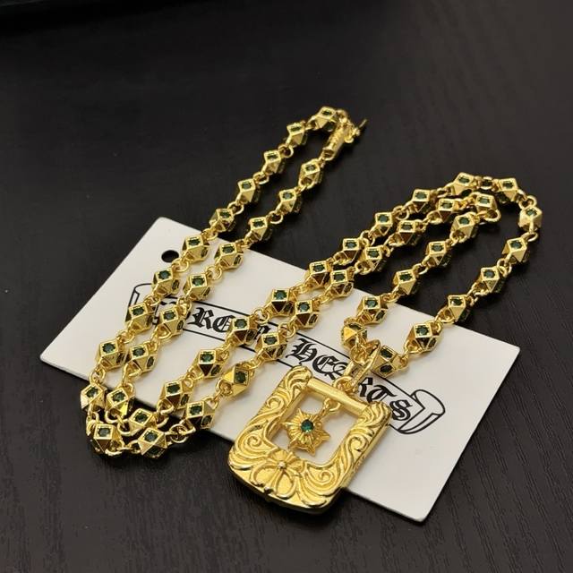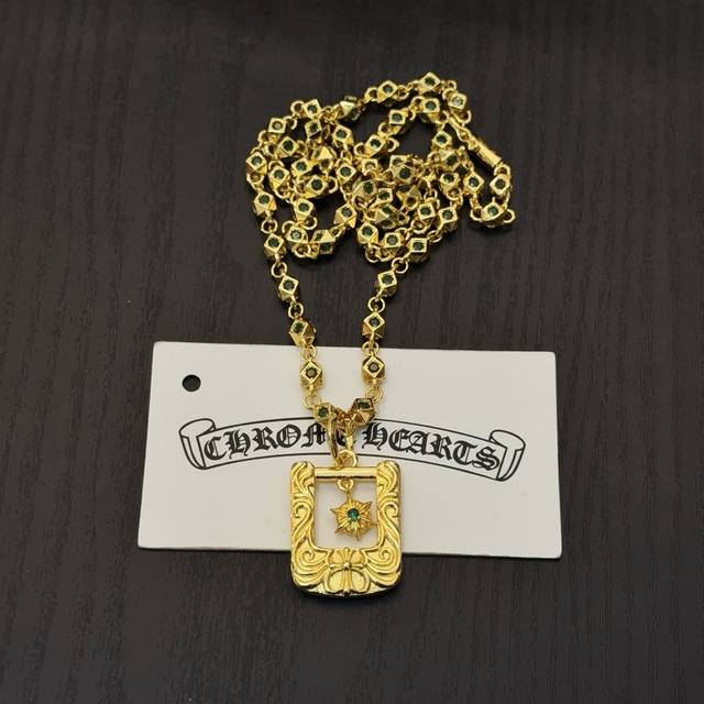 New boutique quality Chrome Hearts classic gold and green diamond necklace with square cross pendant. The embossed design and different patterns create a unique look. The cross and scout flower are Chrome Hearts' signature elements, making it timeless. Authentic Chrome Hearts replica, distinguishing it from ordinary market versions. Quality is top-notch, as seen in the lettering details, vintage finish, and gray alumina level. Exquisite craftsmanship! Handmade! Authentic mold, trendy and fashionable, a must-have for men and women, suitable for couples. Official website original, rock punk Thai silver style, retro elements, trendy and versatile!