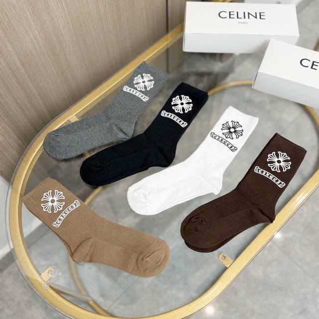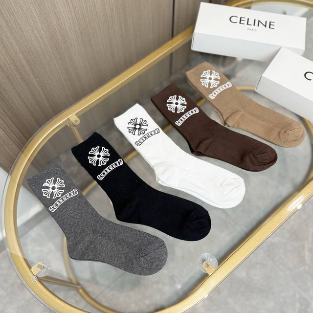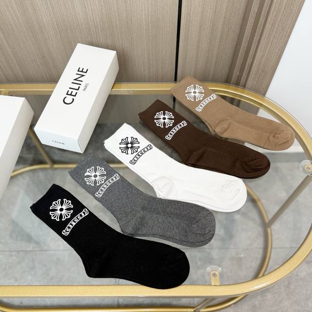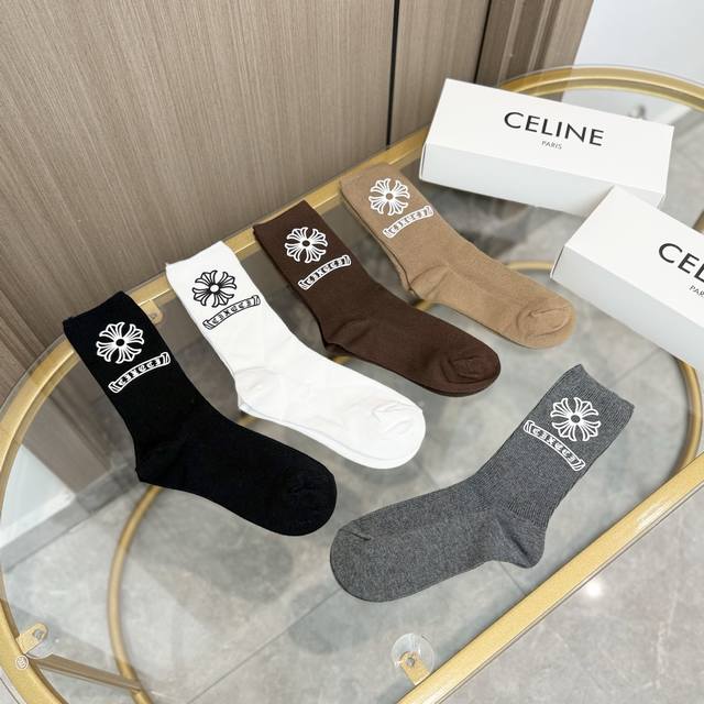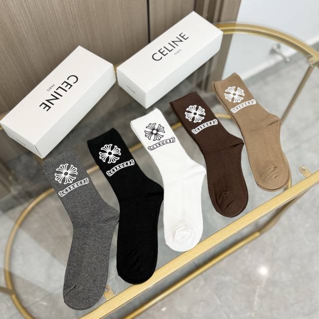 Comes with a box of five pairs of Chrome Hearts' popular high-top socks, high-end version. They are so beautiful! European and American brand high-top socks are a must-have for fashionistas. The combination is super stylish and fashionable. Recommended. A must-have fashionable item!