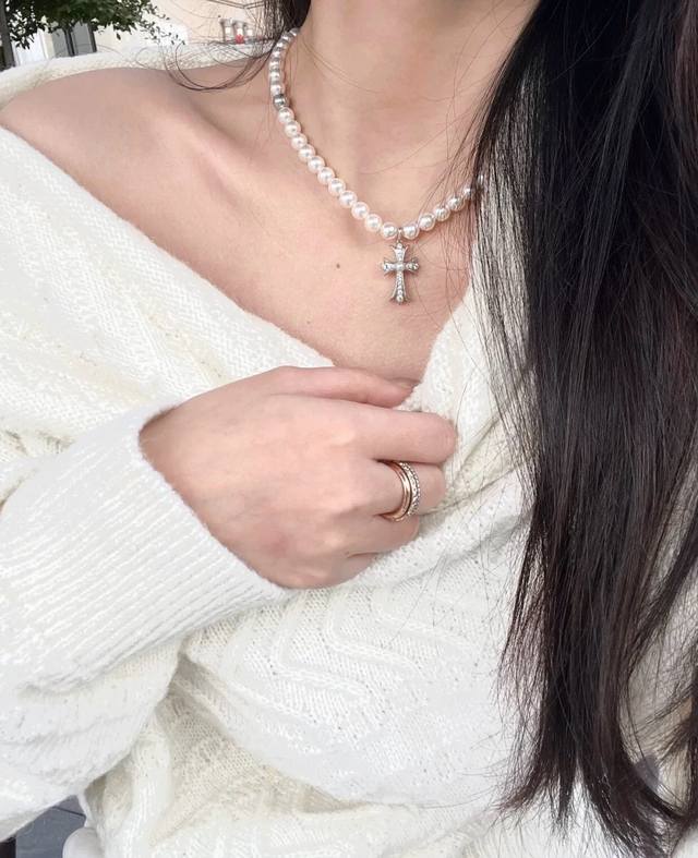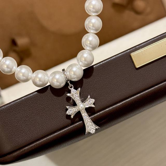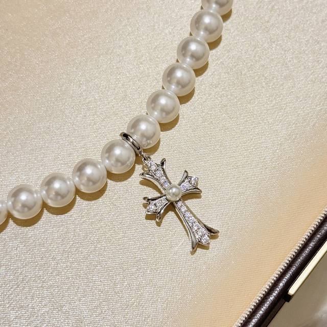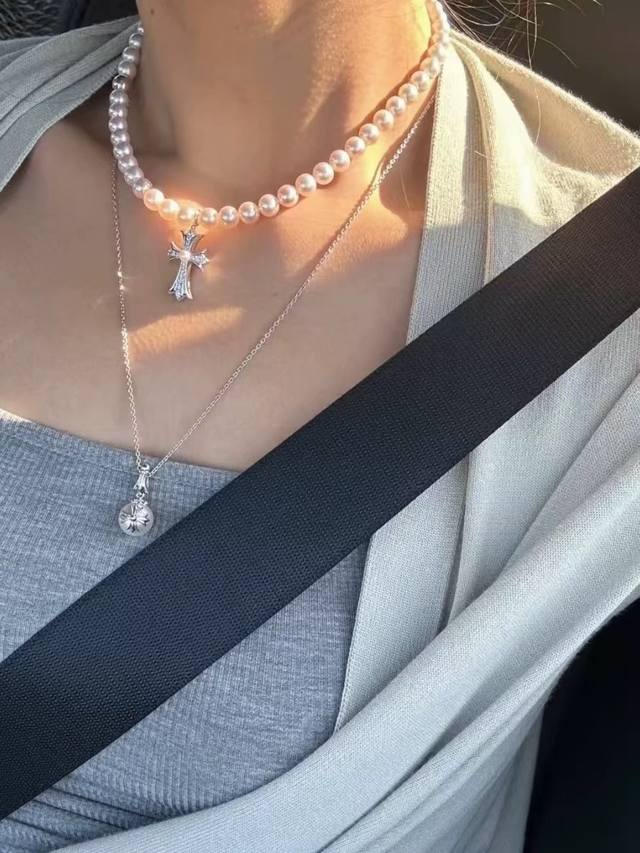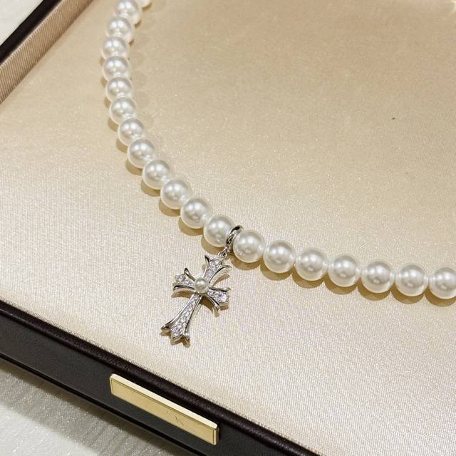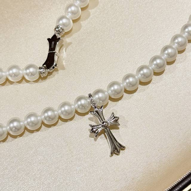 A6602 New Chrome Hearts Element Cross Pearl Necklace, Popular Style, High-Quality Metal, S925 Sterling Silver, Paired with Natural Shell Pearls, Sweet or Chic, Perfect for Everyday Wear, Platinum Gold Sterling Silver Necklace