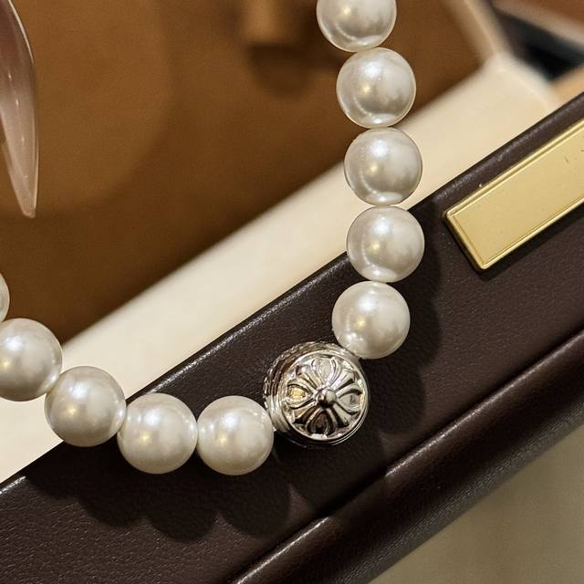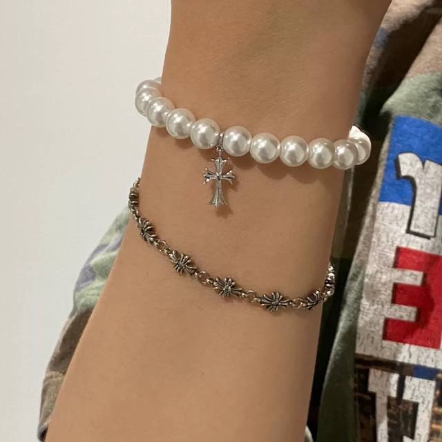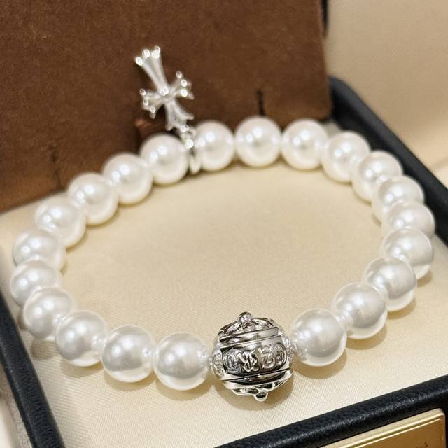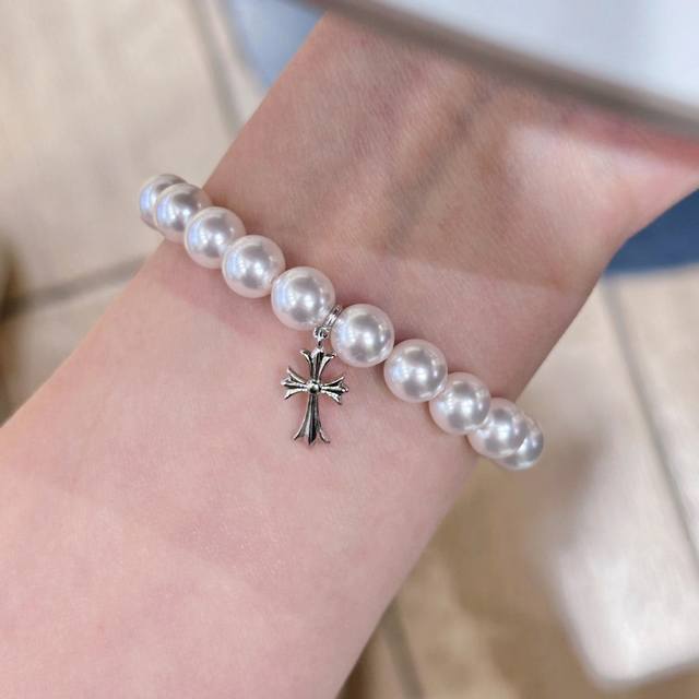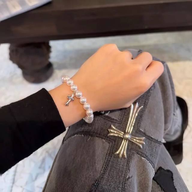 A6813 New Chrome Hearts Cross Pearl Bracelet Internet celebrity style high-quality metal throughout S925 sterling silver material with natural shell pearls, sweet and cool, very suitable for daily wear platinum sterling silver bracelet