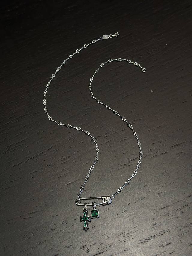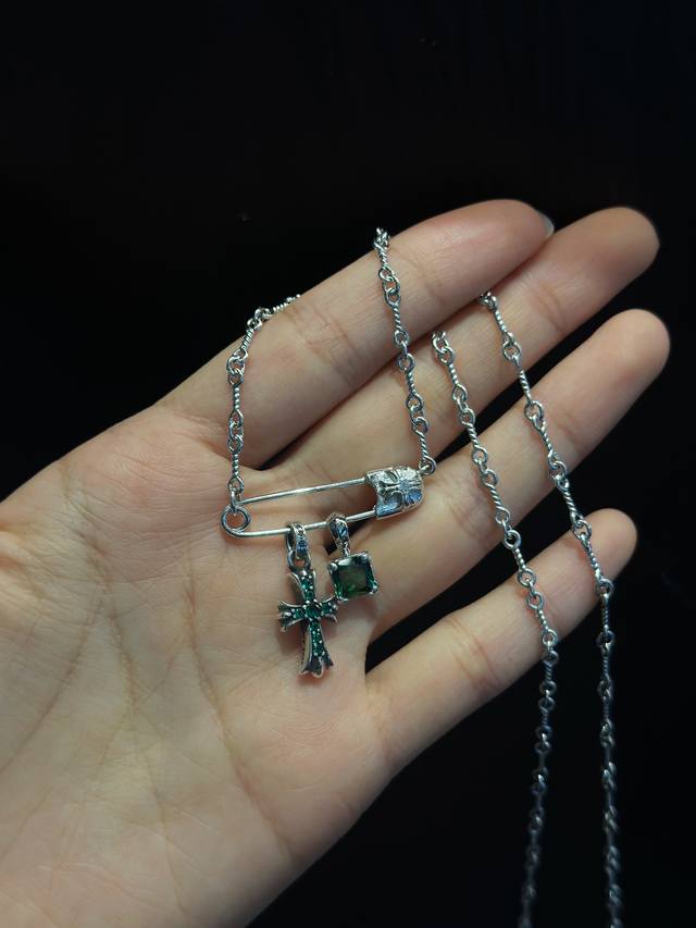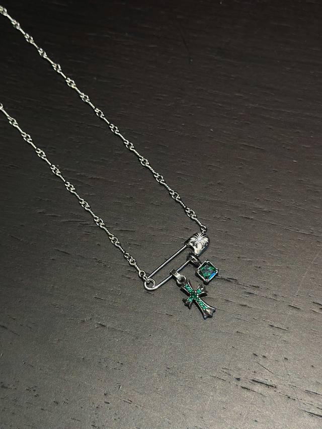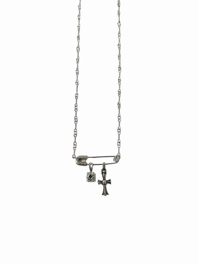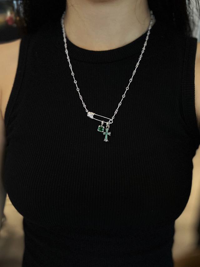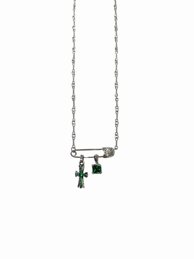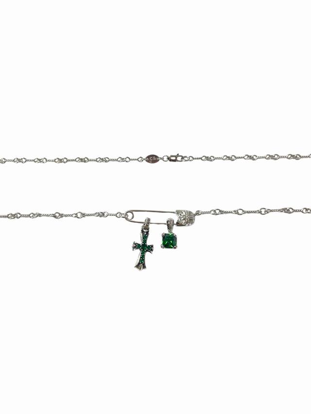 Chrome Hearts Brooch Cross White Gold Plated Green Sugar Cube Necklace