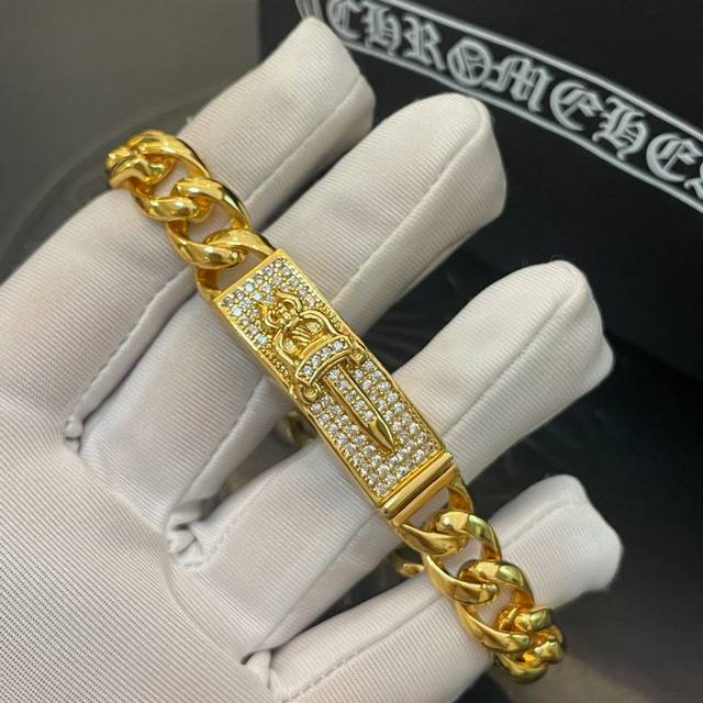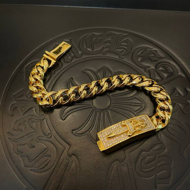 Exclusive quality Chrome Hearts gold classic braided sword bracelet with full diamonds. The embossed design and different patterns create a unique look. The cross and scout flower are Chrome Hearts' iconic symbol, making it timeless. A genuine Chrome Hearts necklace, distinguishable from ordinary versions on the market. Quality is comparable to the original, judging by the details of the lettering, the vintage distressed finish, and the degree of gray oxide. Exquisite craftsmanship! Handmade! Authentic mold, trendy and fashionable, a must-have for men and women, suitable for couples. Official website original, rock punk Thai silver style, retro elements, trendy and versatile!