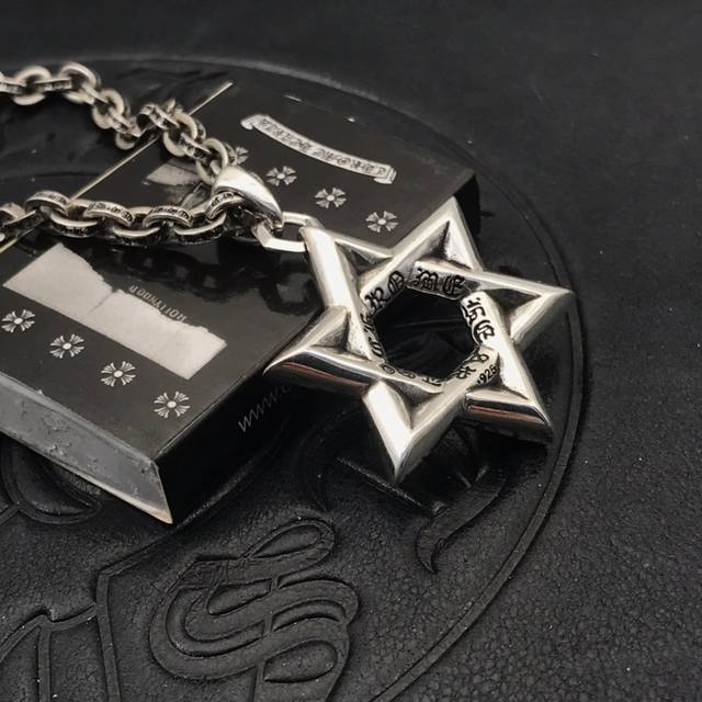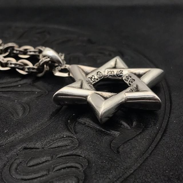 High-quality Chrome Hearts large six-pointed star pendant necklace, worn by numerous celebrities. The design features a gradual increase in size from every angle, with meticulous attention to detail. Includes original handwritten engraving and a letter chain with the letter "