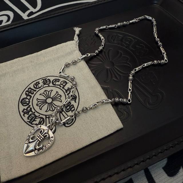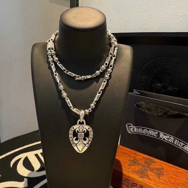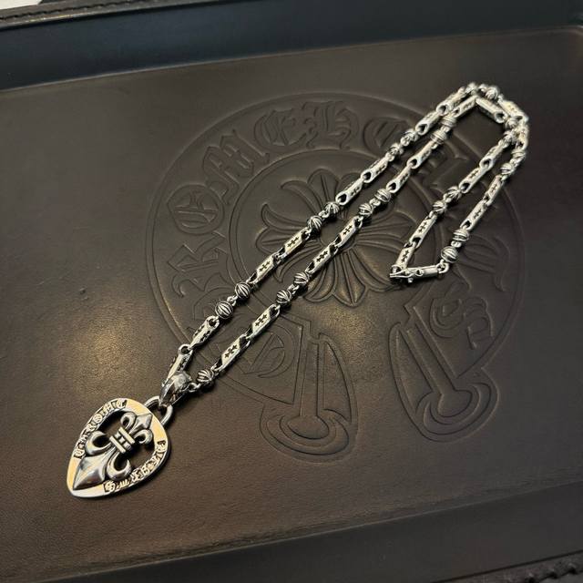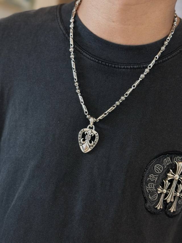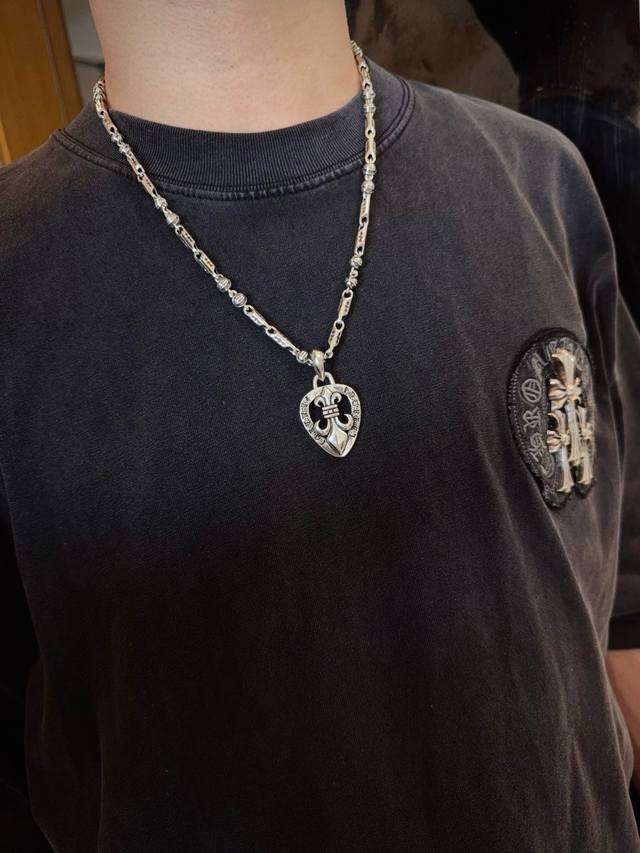 New boutique quality Chrome Hearts classic cross necklace with scout flower heart-shaped pendant. The embossed design and different patterns create a unique look. The cross and scout flower are the hallmark of Chrome Hearts, making them timeless. Authentic Chrome Hearts replica, different from ordinary versions on the market. Quality is top-notch, look at the details of the lettering and the vintage distressed finish. Exquisite craftsmanship! Purely handmade