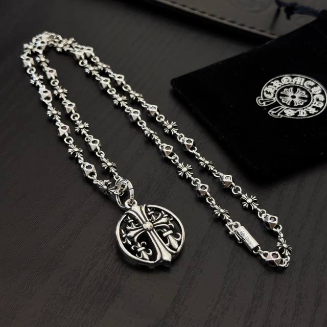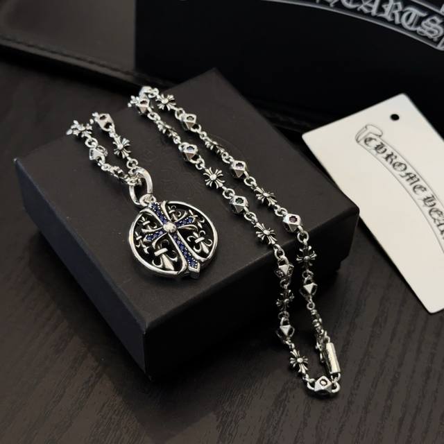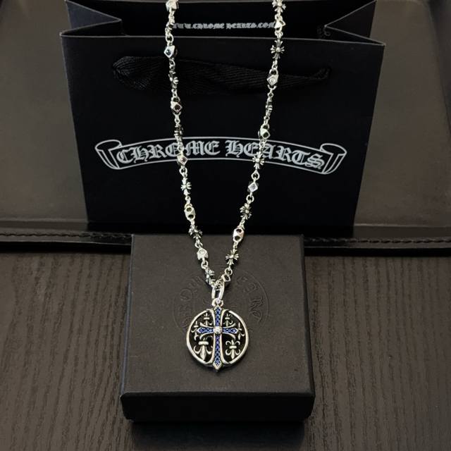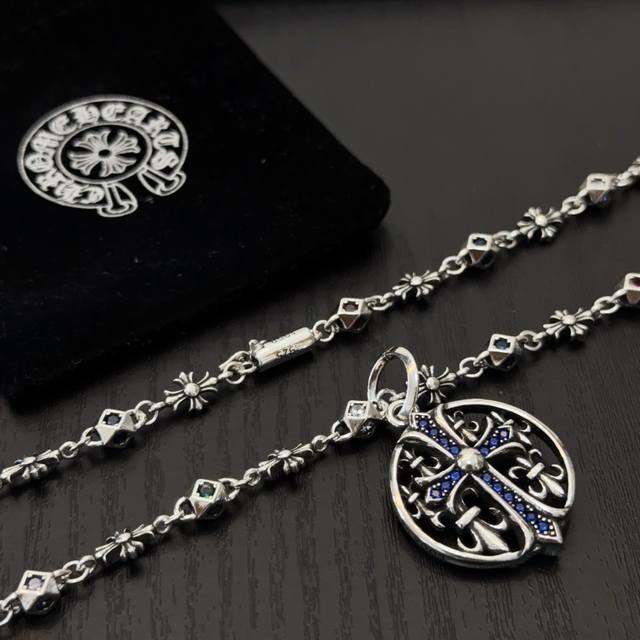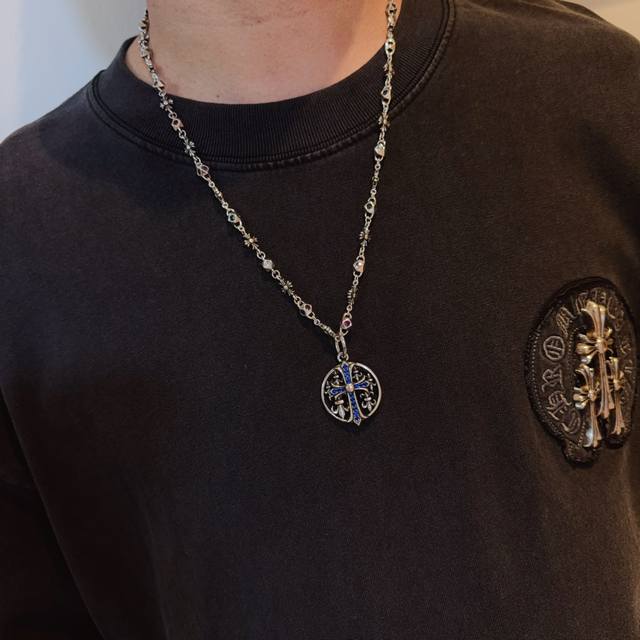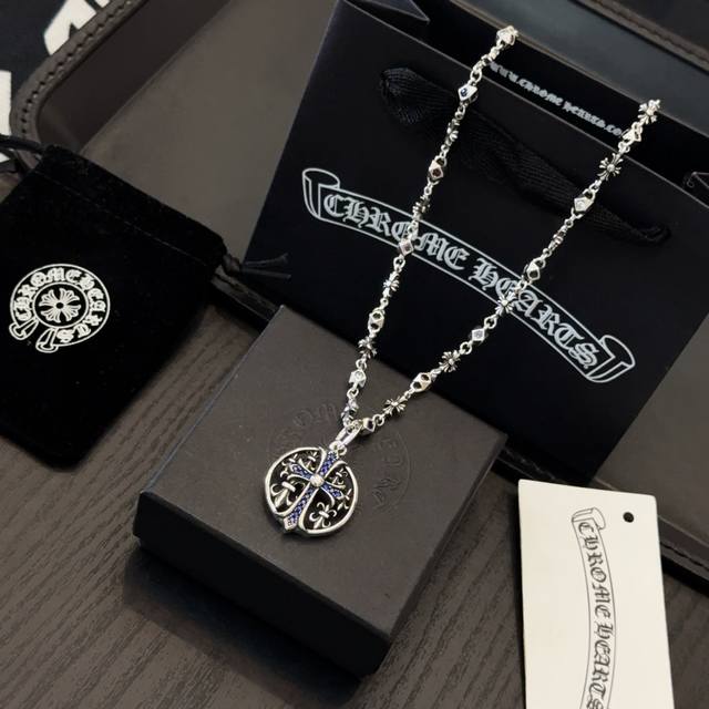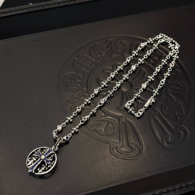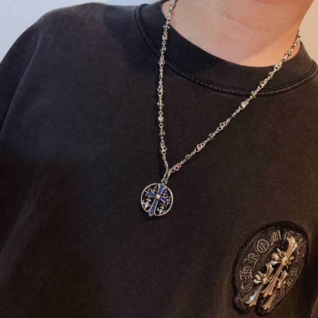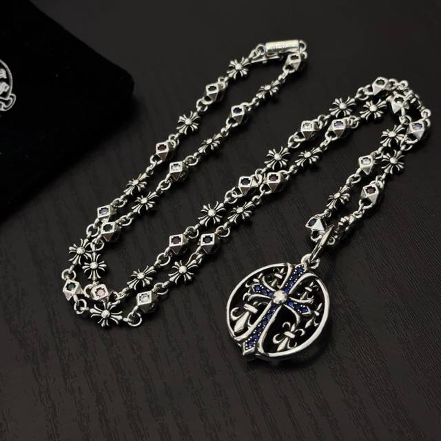 New boutique quality Chrome Hearts classic retro cross diamond necklace, blue diamond T-shaped pendant, different textured patterns present a unique style. The cross and scout flower are the symbol of Chrome Hearts, making them timeless. Authentic Chrome Hearts replica, different from ordinary light versions on the market. Quality is comparable to the original, look at the details of the lettering, the vintage distressed finish, and the gray oxide level. Exquisite craftsmanship! Purely handmade~ Authentic mold, trendy and fashionable, a must-have for men and women, suitable for couples. Official website original, rock punk Thai silver style, retro elements, trendy and versatile!