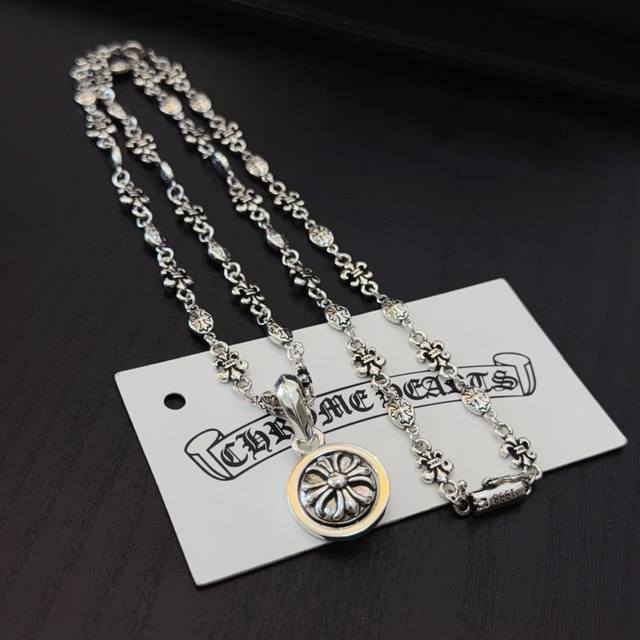 New boutique quality Chrome Hearts classic retro cross flower necklace. The horseshoe print cross flower pendant features an embossed design with different patterns, creating a unique look. The cross and scout flower are Chrome Hearts' signature colors, making them timeless. Authentic Chrome Hearts replica, distinguishing it from ordinary market versions. Quality is top-notch, evident in the lettering details, vintage distressing finish, and gray alumina level. Exquisite craftsmanship! Handmade! Authentic mold, trendy and fashionable, a must-have for men and women, suitable for couples. Official website original, rock punk Thai silver style, retro elements, trendy and versatile!