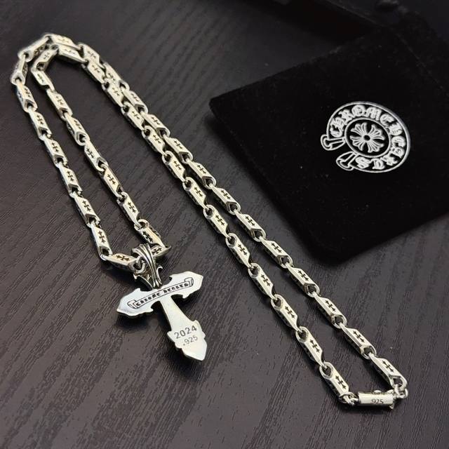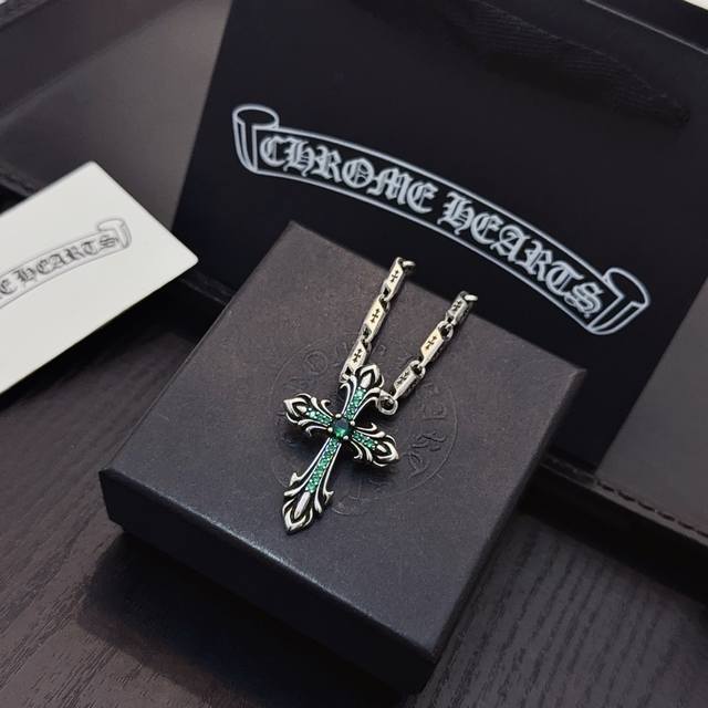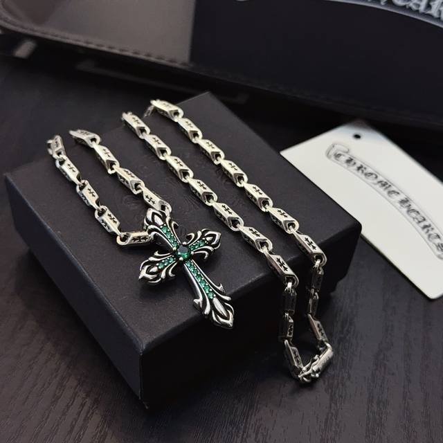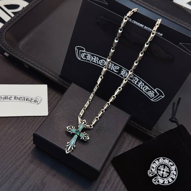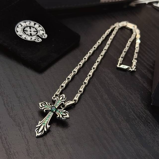 New boutique quality Chrome Hearts classic retro cross necklace, green diamond cross pendant with embossed design and different patterns, presenting a unique style. The cross and scout flower are Chrome Hearts' symbol, making it timeless. Authentic Chrome Hearts replica, different from ordinary market versions. Quality is comparable to the original, look at the details of the lettering and the vintage distressed finish. Exquisite craftsmanship! Purely handmade~ Authentic mold, trendy and fashionable, a must-have for men and women, suitable for couples. Official website original, rock punk Thai silver style, retro elements, trendy and versatile! DDD