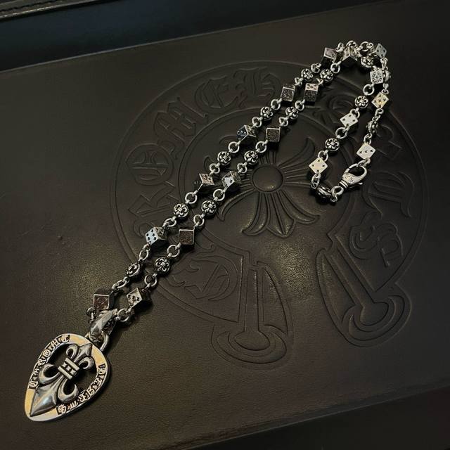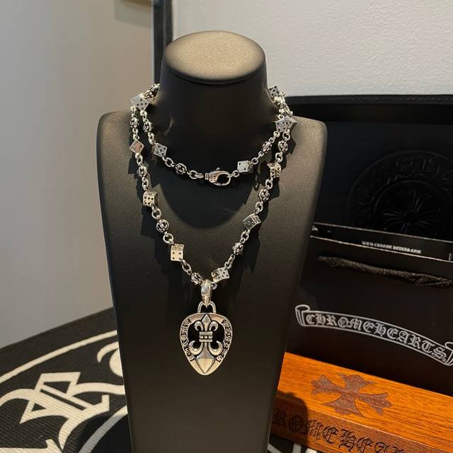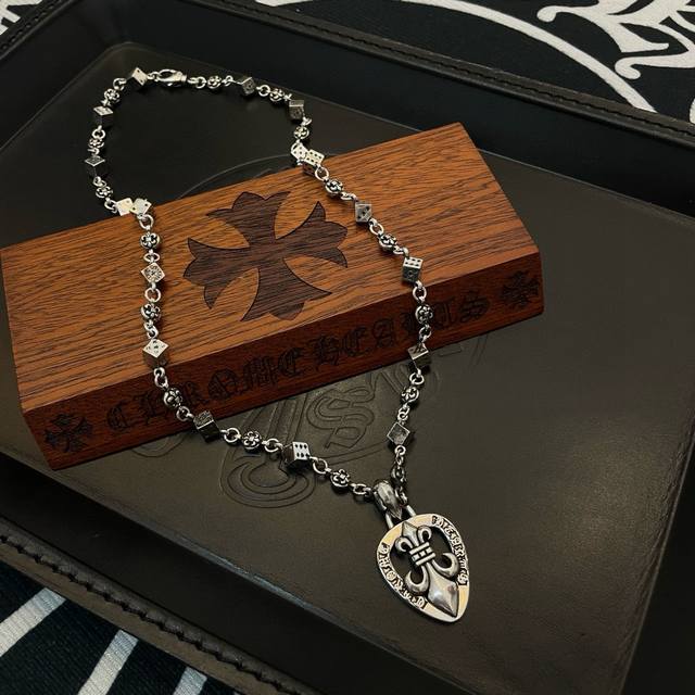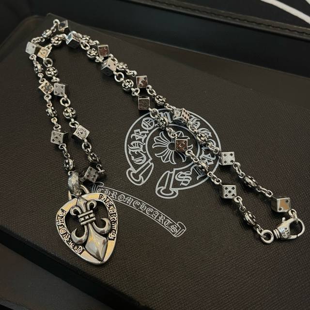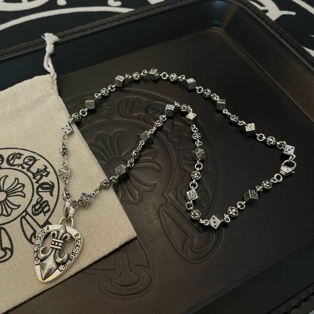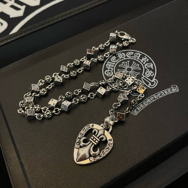 New boutique quality Chrome Hearts classic retro floral ball dice necklace with heart-shaped scout flower pendant. The embossed design and different patterns create a unique look. The cross and scout flower are Chrome Hearts' signature colors, making them timeless. Authentic Chrome Hearts replica, different from ordinary versions on the market. High-quality replica with detailed lettering and vintage distressing. Exquisite craftsmanship! Handmade! Authentic mold, trendy and fashionable, suitable for both men and women, couples. Official website original, rock punk Thai silver style, retro elements, trendy and versatile!