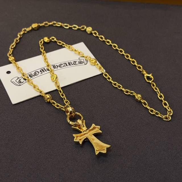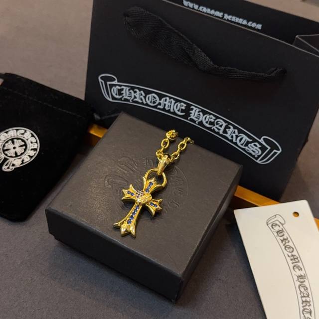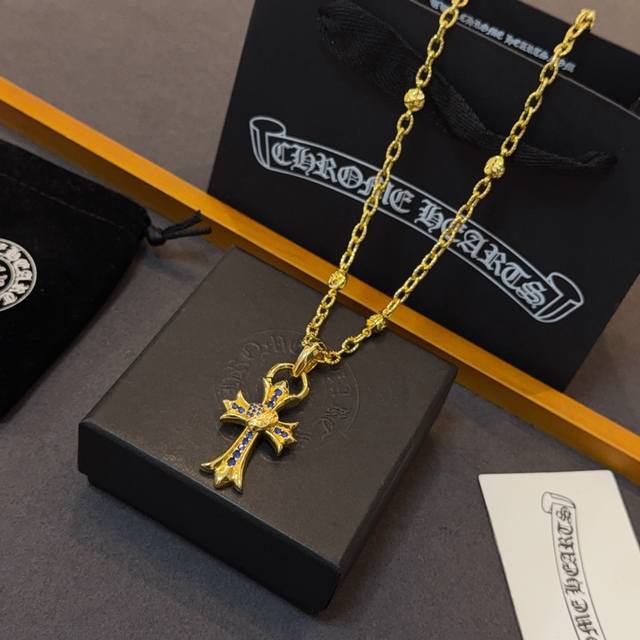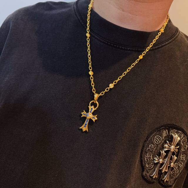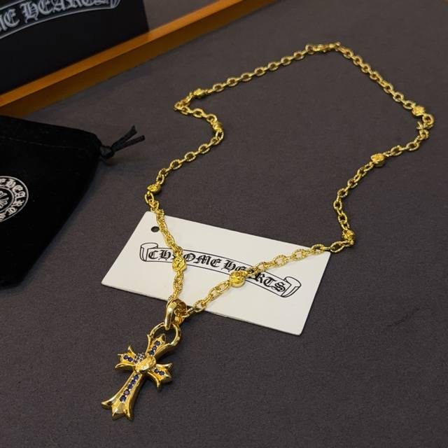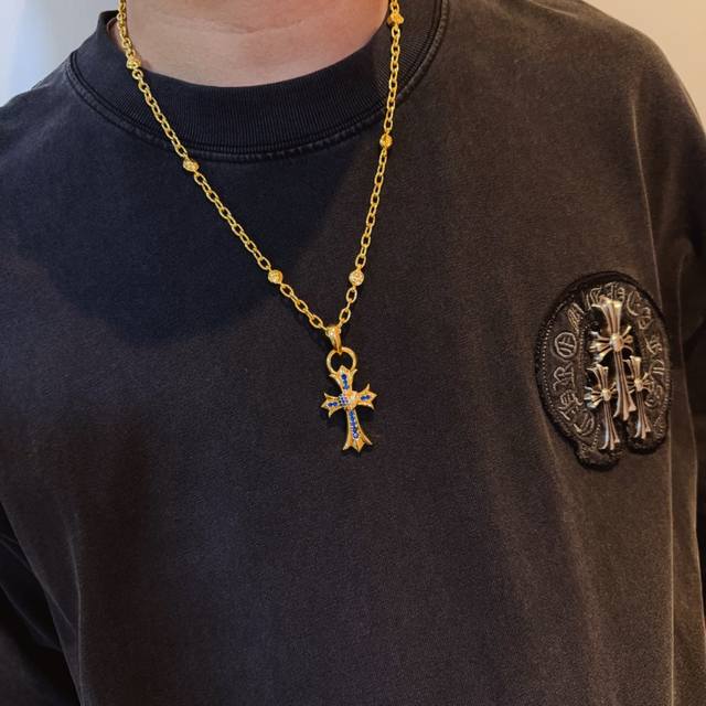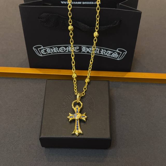 New boutique quality Chrome Hearts classic retro gold letter necklace, blue diamond heart and cross pendant, embossed design with different patterns, presenting a unique style. The cross and scout flower are Chrome Hearts' symbol, making it timeless. Authentic Chrome Hearts replica, different from ordinary light versions on the market. Quality is comparable to the original, look at the details of the lettering, the vintage distressed finish, and the gray oxide level. Exquisite craftsmanship! Purely handmade~ Authentic mold, trendy and fashionable, a must-have for men and women, suitable for couples. Official website original, rock punk Thai silver style, retro elements, trendy and versatile!