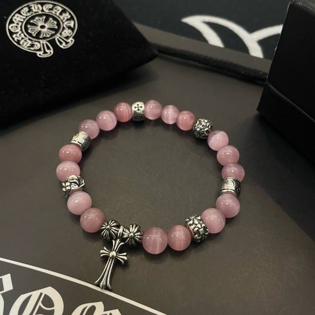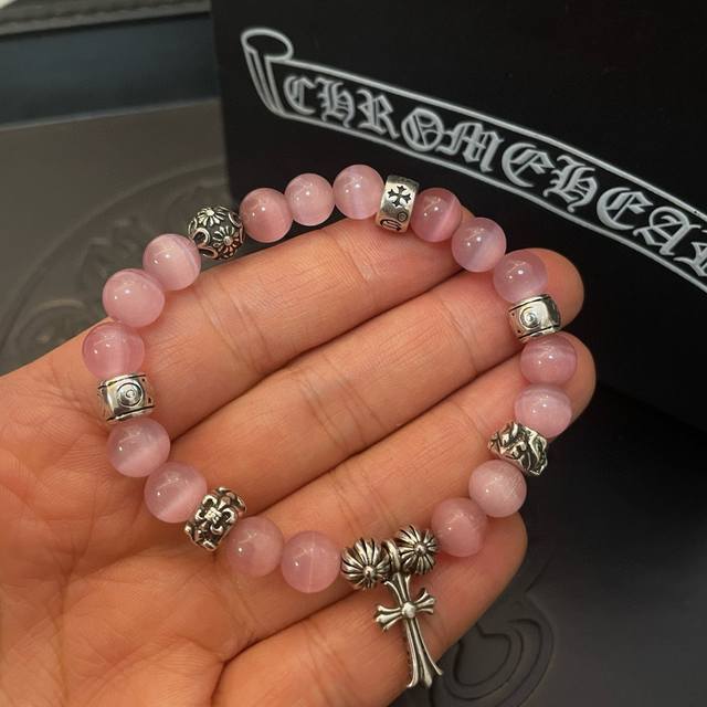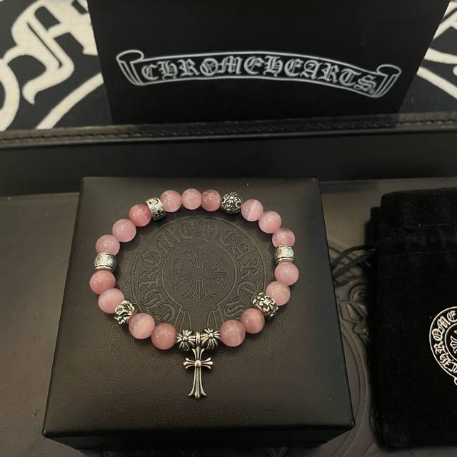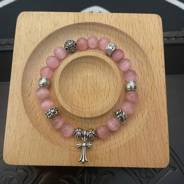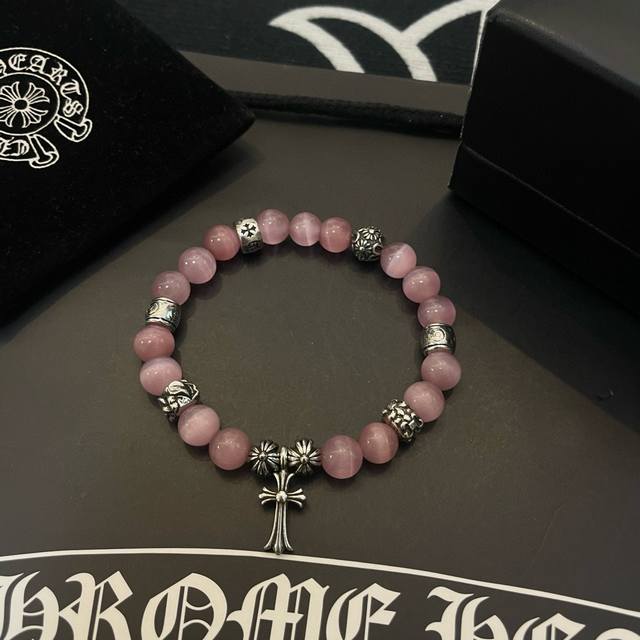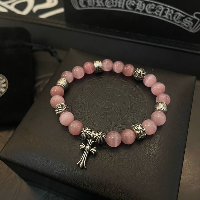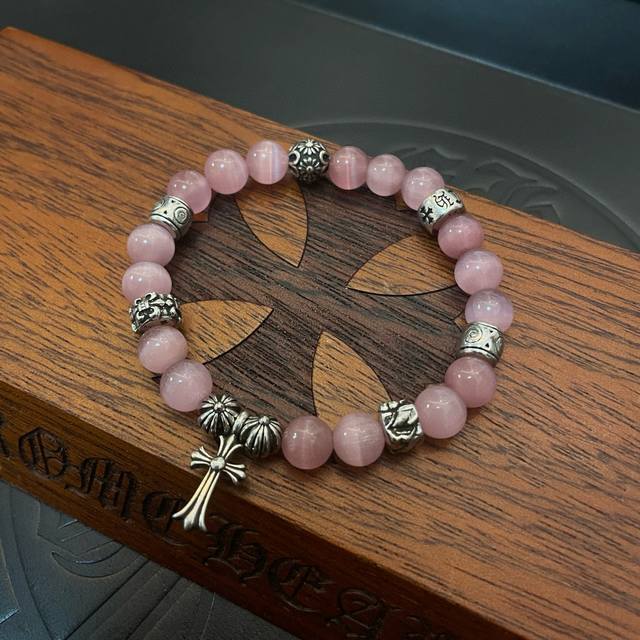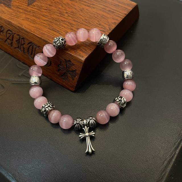 New boutique quality Chrome Hearts classic retro multi-element pink cat's eye stone bracelet, popular on Kuaishou, Ins, and Xiaohongshu. The embossed design with different patterns presents a unique style. The cross and scout flower are Chrome Hearts' signature colors, making them timeless. Authentic Chrome Hearts replica, different from ordinary versions on the market. Quality is comparable to the original, judging by the details of the lettering and the vintage, aged finish. Exquisite craftsmanship!