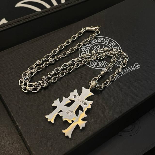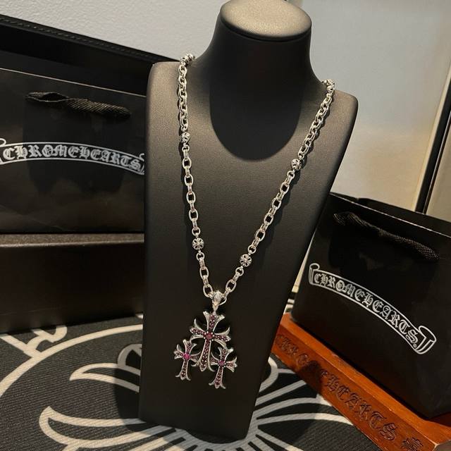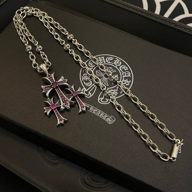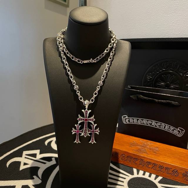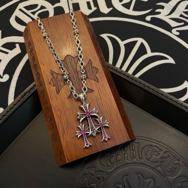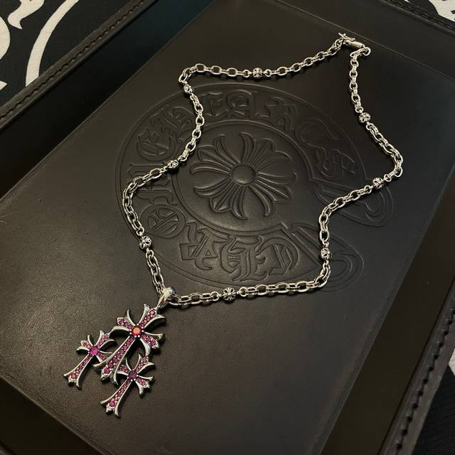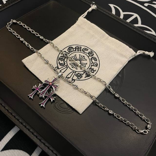 New boutique quality Chrome Hearts classic retro necklace, pink with full diamonds and a thirty-cross pendant. The embossed design and different patterns create a unique look. The cross and scout flower are Chrome Hearts' signature elements, making it timeless. Authentic Chrome Hearts replica, different from ordinary versions on the market. High-quality replica, look at the details of the lettering and the vintage distressed finish. Exquisite craftsmanship! Handmade! Authentic mold, trendy and fashionable, a must-have for men and women, suitable for couples. Official website original, rock punk Thai silver style, retro elements, trendy and versatile!