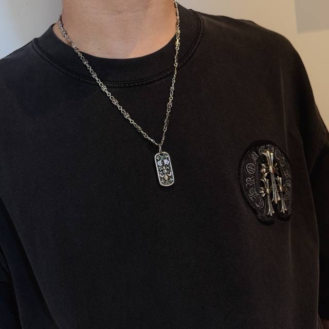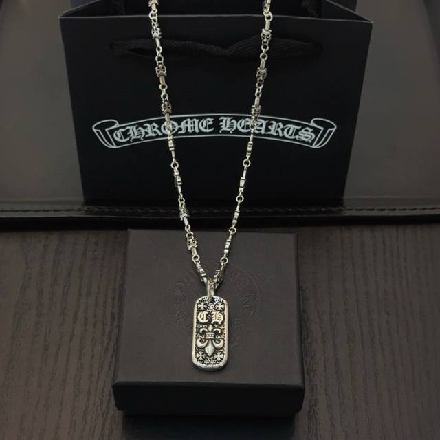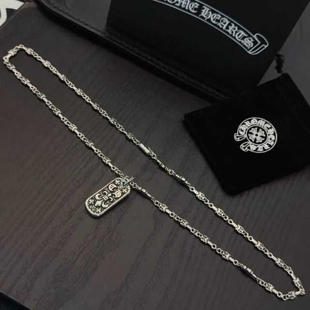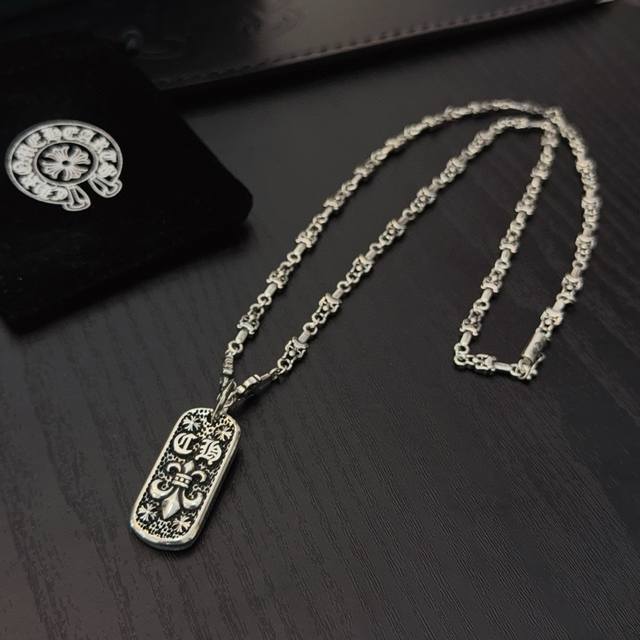 New boutique quality Chrome Hearts classic retro sword necklace. The square pendant features an embossed design with different patterns, creating a unique look. The cross and scout flower are Chrome Hearts' iconic symbol, making it timeless. Authentic Chrome Hearts replica, distinguishing it from ordinary market versions. Quality is guaranteed; look at the details of the lettering and the vintage, distressed finish. Exquisite craftsmanship! Handmade! Authentic mold, trendy and fashionable, a must-have for men and women, suitable for couples. Official website original, rock punk Thai silver style, retro elements, trendy and versatile!