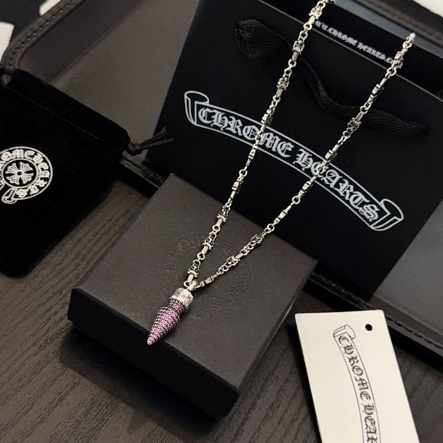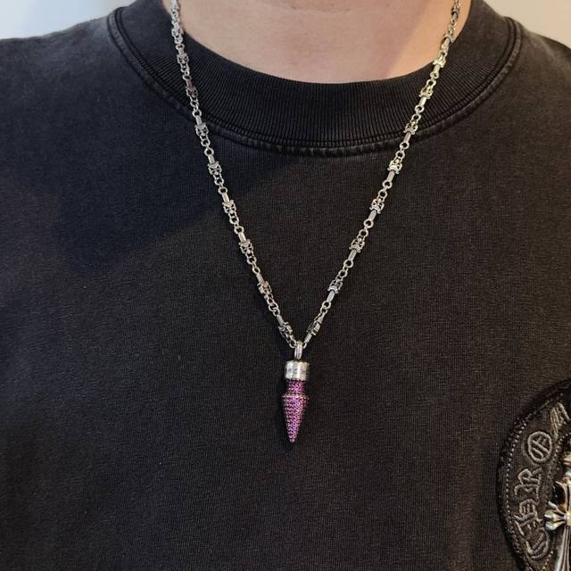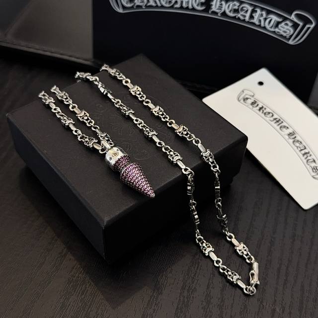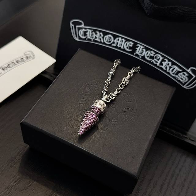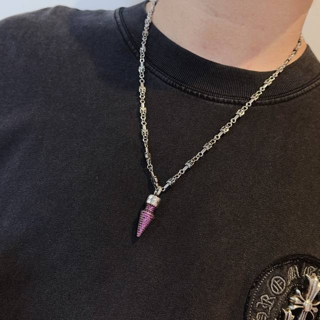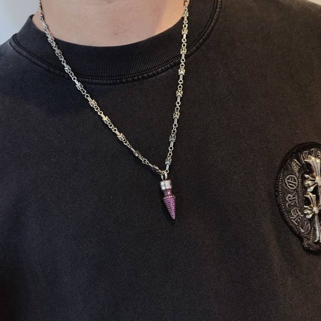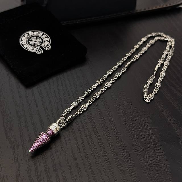 New boutique quality Chrome Hearts classic retro sword necklace with pink diamond bullet pendant. The embossed design and different patterns create a unique look. The cross and scout flower are Chrome Hearts' iconic symbol, making it timeless. Authentic Chrome Hearts replica, different from ordinary versions on the market. High-quality replica with detailed lettering and vintage distressing. Exquisite craftsmanship! Handmade! Authentic mold, trendy and fashionable, suitable for both men and women, couples. Official website original, rock punk Thai silver style, retro elements, trendy and versatile!