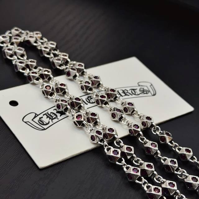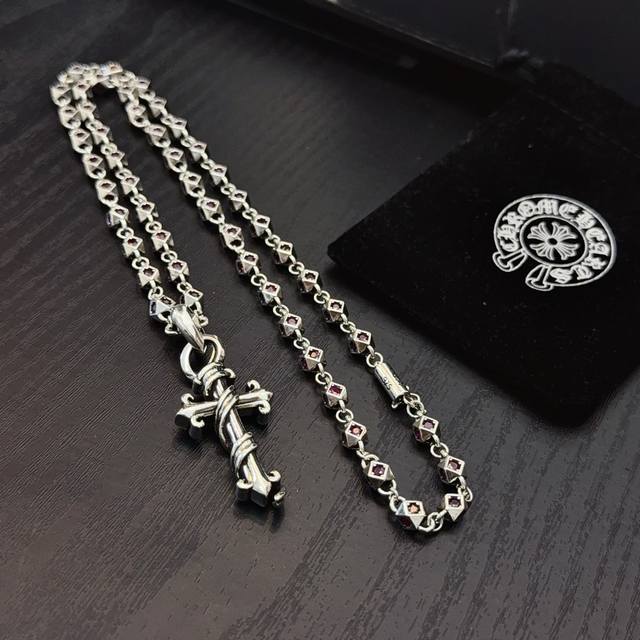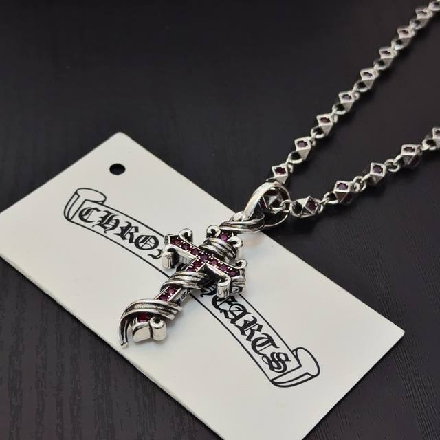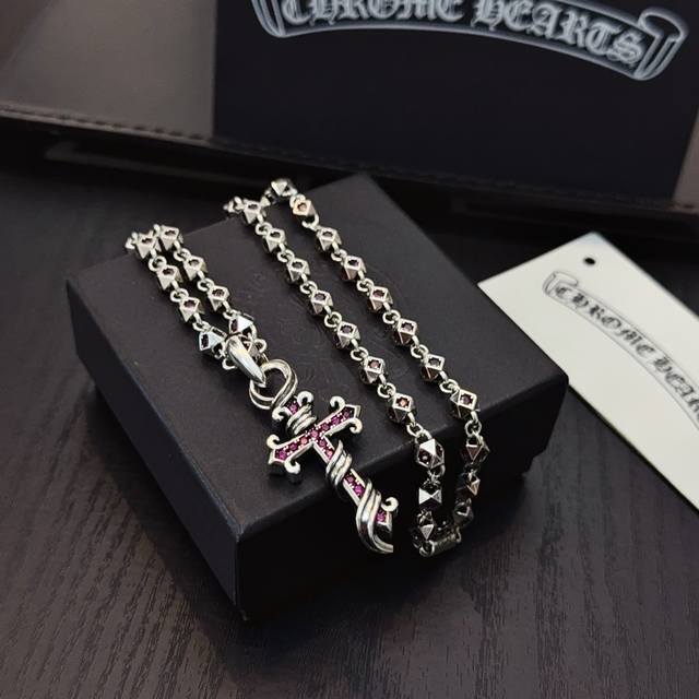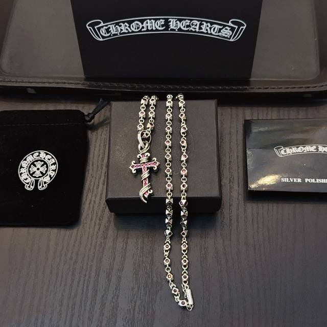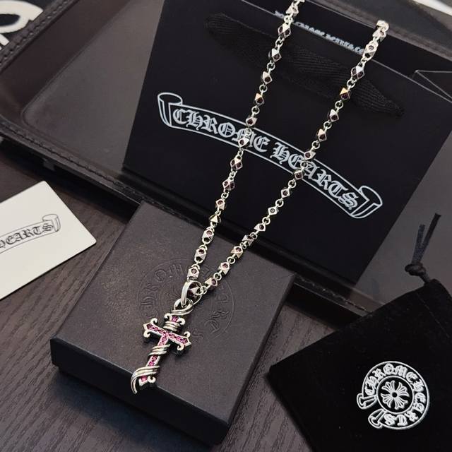 New boutique quality Chrome Hearts pink diamond necklace. The pink diamond cross pendant features a unique design with different textures and patterns. The cross and scout flower are the hallmarks of Chrome Hearts, making them timeless. Authentic Chrome Hearts replica, distinguishing it from ordinary versions on the market. Quality is guaranteed; look at the details of the lettering and the vintage, distressed finish. Exquisite craftsmanship! Handmade. Authentic mold, trendy and fashionable, suitable for both men and women, perfect for couples. Official website original, rock punk Thai silver style, retro elements, trendy and versatile!