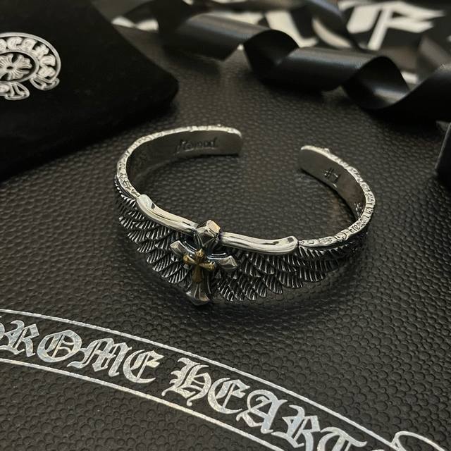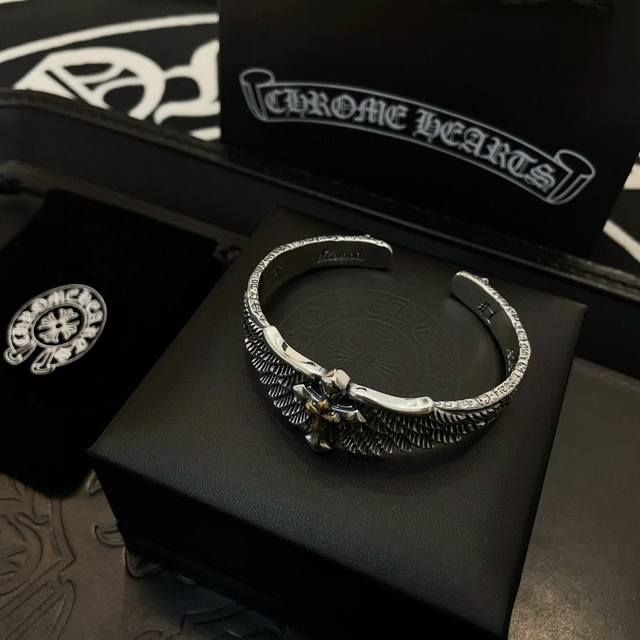 This Chrome Hearts cross-wing open bracelet boasts a unique design with embossed details and varied patterns. The cross and scout flower are the hallmarks of Chrome Hearts, making them timeless. A genuine Chrome Hearts necklace, distinguished from ordinary versions on the market. The quality is top-notch, evident in the lettering details, vintage finish, and gray alumina level. Exquisite craftsmanship! Handmade