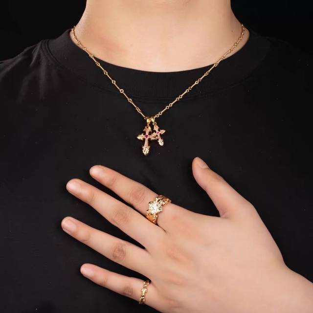 Zongkeluo heart double cross pendant gold-plated 22K gold diamond bamboo necklace for men and women couples