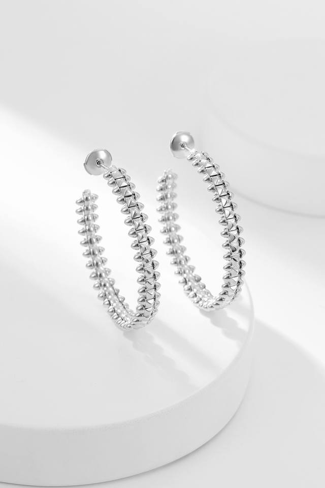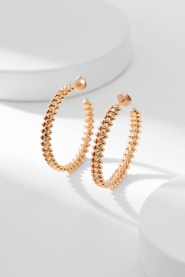 Clash series large earrings strive for a classic design while transcending the classic. Their simple lines exude captivating charm, showcasing a bold and unrestrained attitude within an inherently balanced structure; a delicate femininity is felt within the purity of geometric sharp lines; and a gentle, alluring charm is experienced within a tightly structured, taut form.
