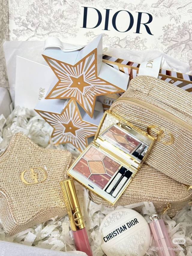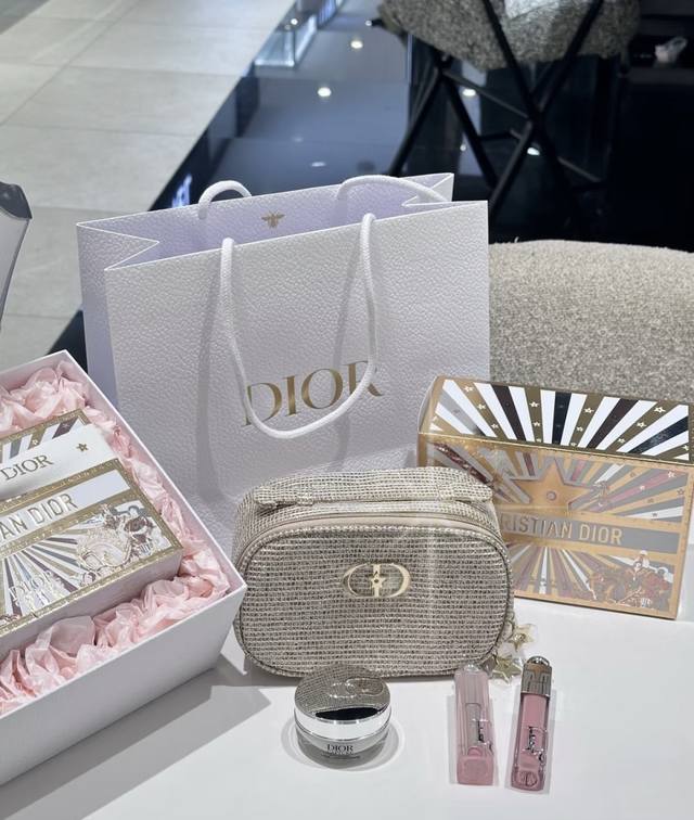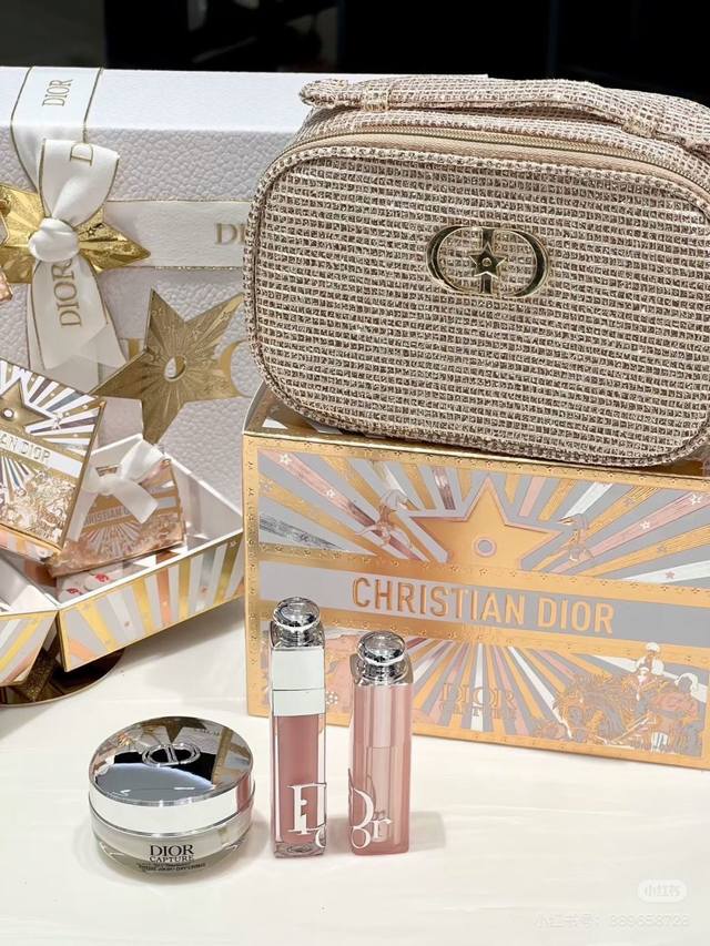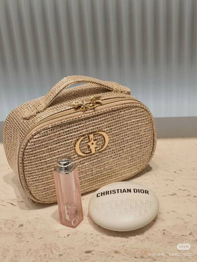 High-end quality Dior leather bag and makeup three-piece set, Christmas limited edition! Includes: textured woven makeup bag + top-selling lip balm + hand cream.