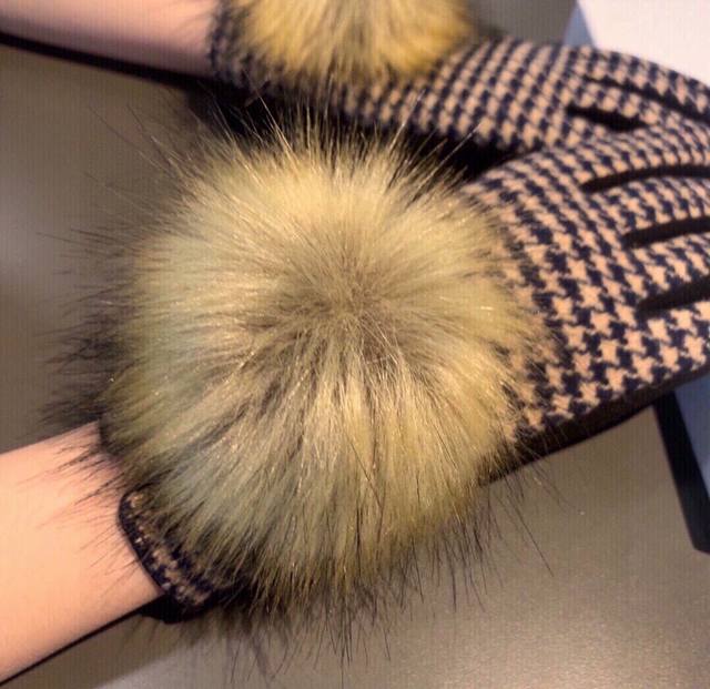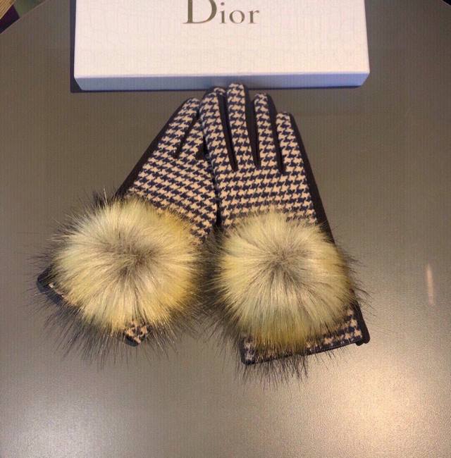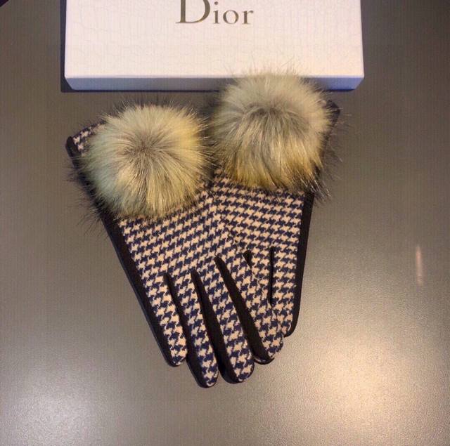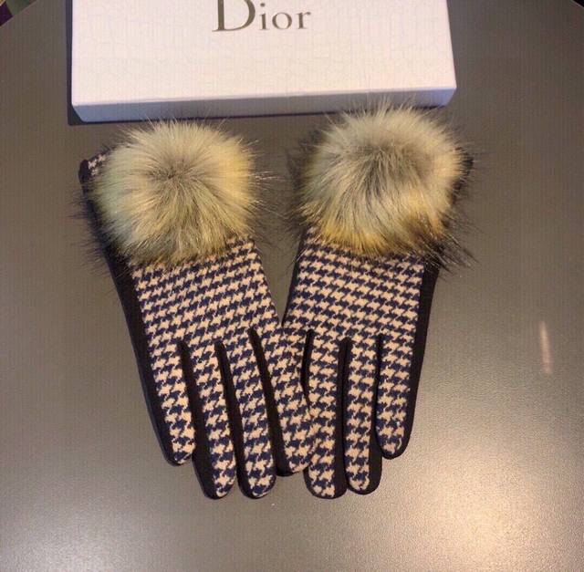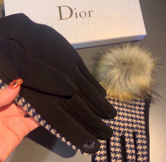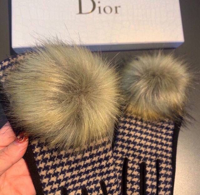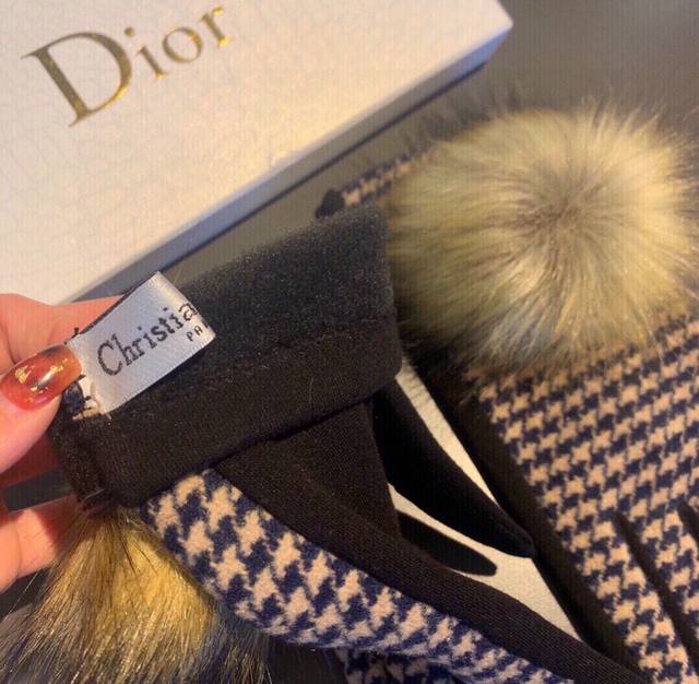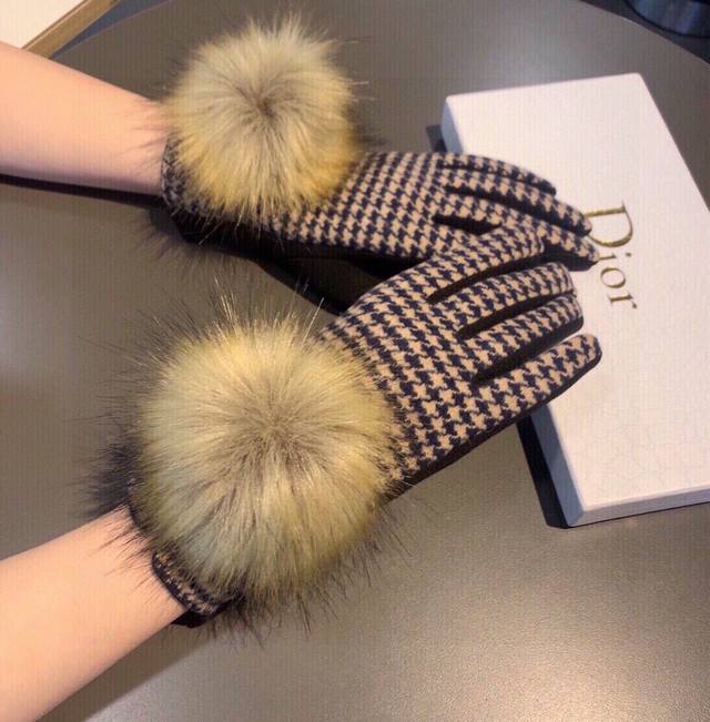 2025 Dior counter new arrival large fox fur wool gloves, fashionable gloves, autumn and winter warmth essential, plush lining, houndstooth pattern, super comfortable and soft, versatile! Comes with box, one size