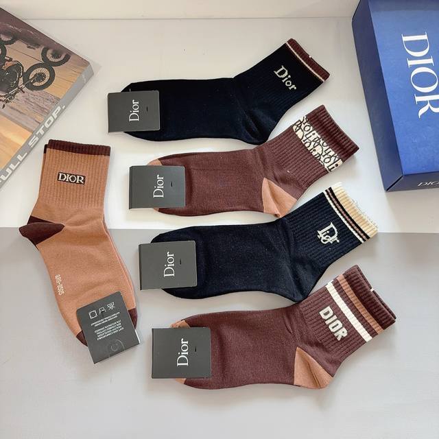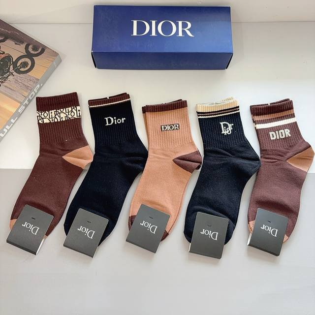 A box of 5 pairs of Dior men's mid-calf socks with packaging. Made of pure cotton, a must-have for trendsetters. Classic, stylish, and versatile. You deserve to own them!