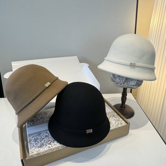 Black Dior Fall/Winter Wool Bucket Hat. A very stylish design! A different style from previous ones, this exquisite and simple one is more to my liking. The irregular shape makes it a must-have for airport fashion! It's incredibly versatile! Made of black and white with a satin silk lining and an embroidered logo. Material: % Wool. Head circumference: 57cm.