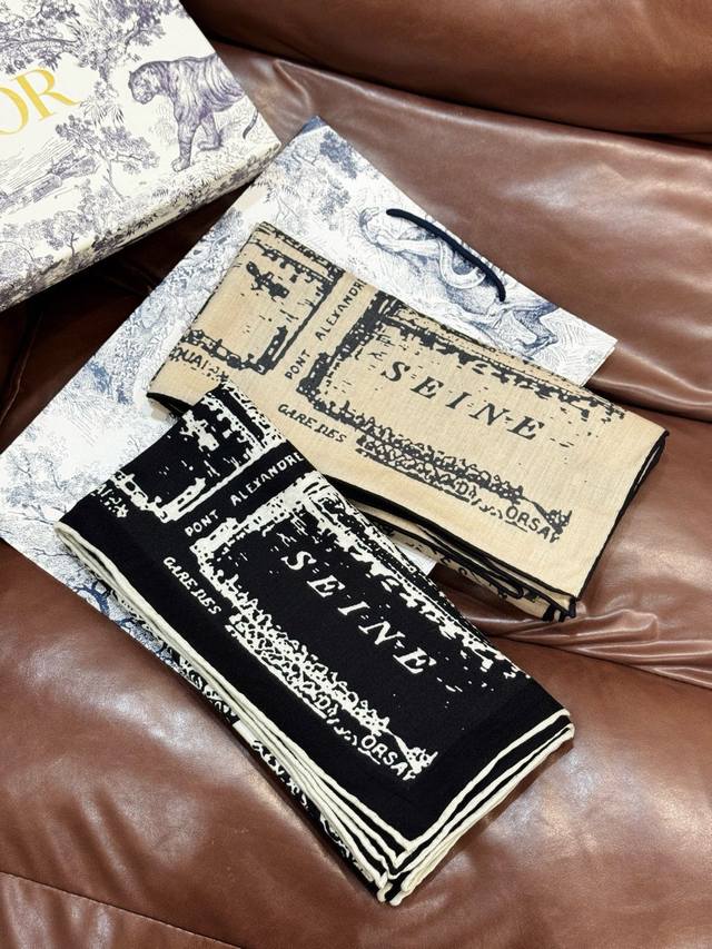 This scarf features this season's classic Lan De Aris print, inspired by the Dior archives and paying homage to Dior's historic Avenue Montaigne address.