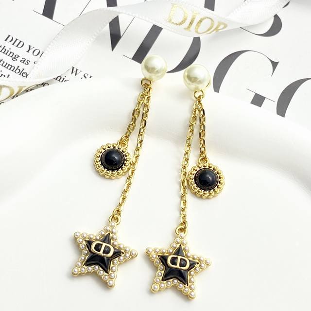 Dior's hot-selling earrings are now available! Dior's black star pearl tassel earrings are designed with a double tassel chain, one long and one short asymmetrical pendant, a round pearl star, and a circle of small pearls around the five-pointed star. They are playful, cute, and smart.
