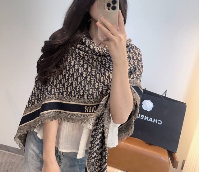 High-quality Dior shawl/scarf. The classic monogram print paired with the luxurious texture of a silk-wool blend makes it a perfect match for ready-to-wear and accessories. Size: 140 x 140cm. Fabric: 57% wool, 43% silk. Dior 1:1 monogram jacquard weave. Full floral print.