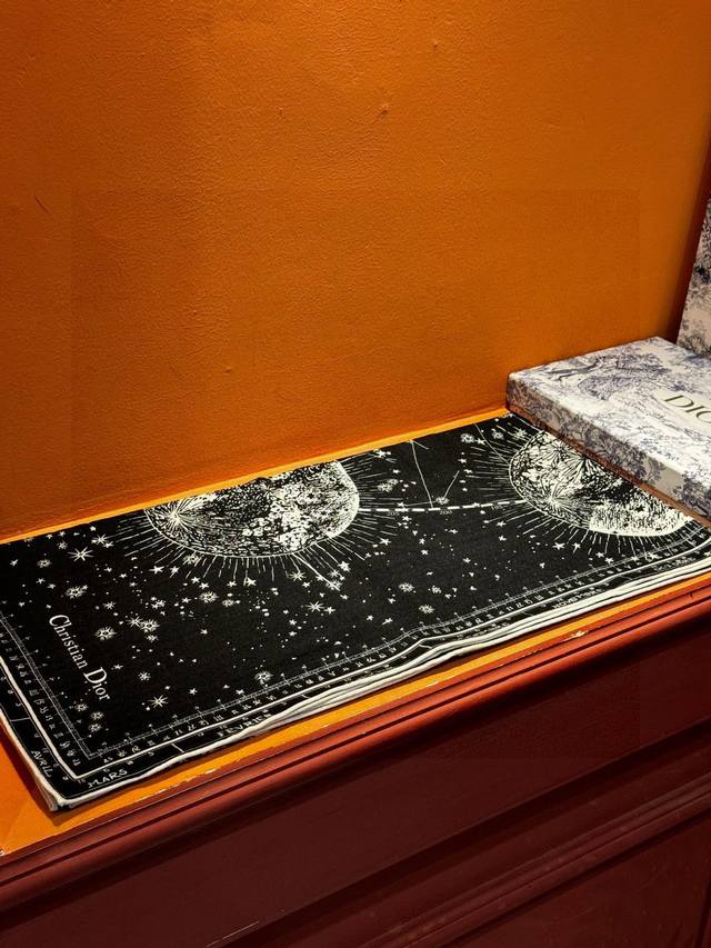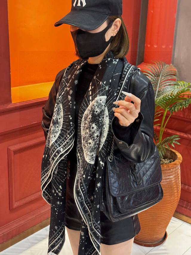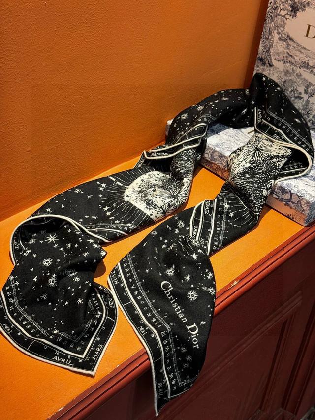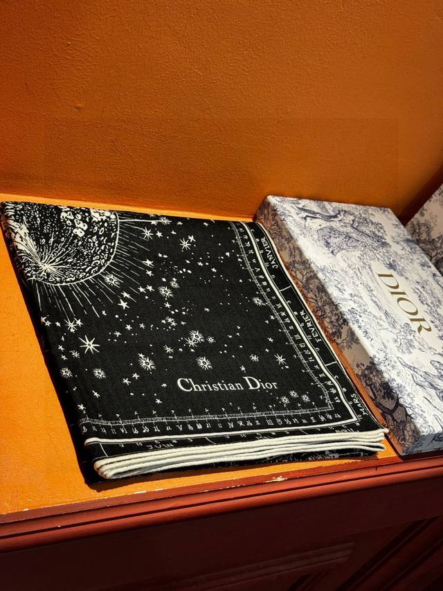 New Arrival: Dior Phases Lunaires Scarf {140cm Silk & Cashmere} Mulberry Silk + Cashmere. Featuring a Dior Phases Lunaires print designed by Pietro Ruffo, this scarf showcases a moon motif in a constellation style, inspired by Mr. Dior's love of astrology. The Christian Dior logo jacquard stripes are embellished with constellation patterns, adding a touch of sophistication. It can be worn around the neck to add a finishing touch to various fashion looks, or paired with other Dior Phases Lunaires items. Available in black and ivory. Dior Phases Lunaires print with constellation patterns. Size: 140*140cm.