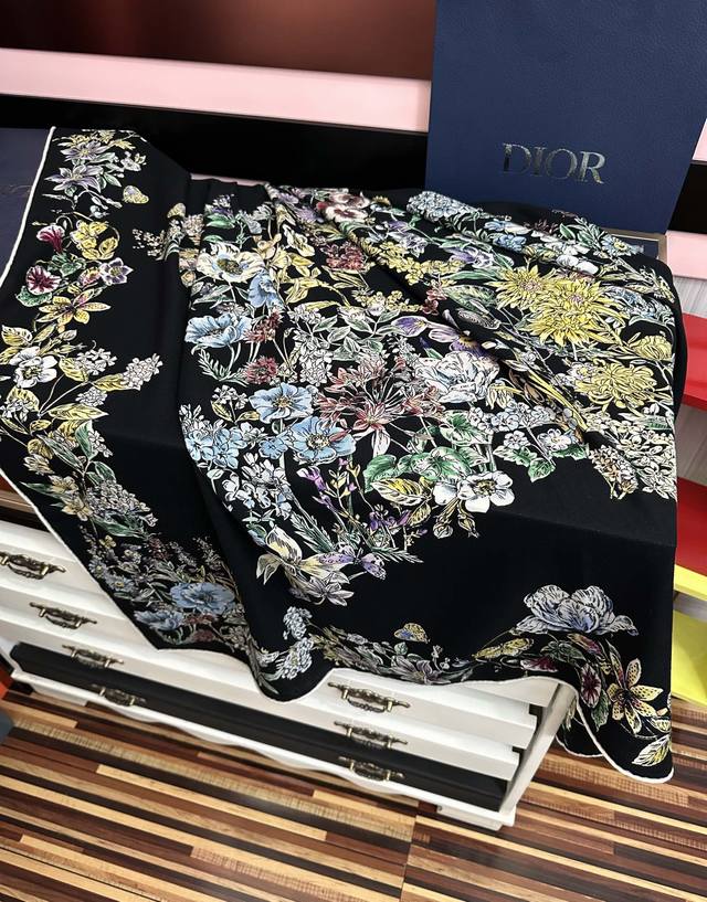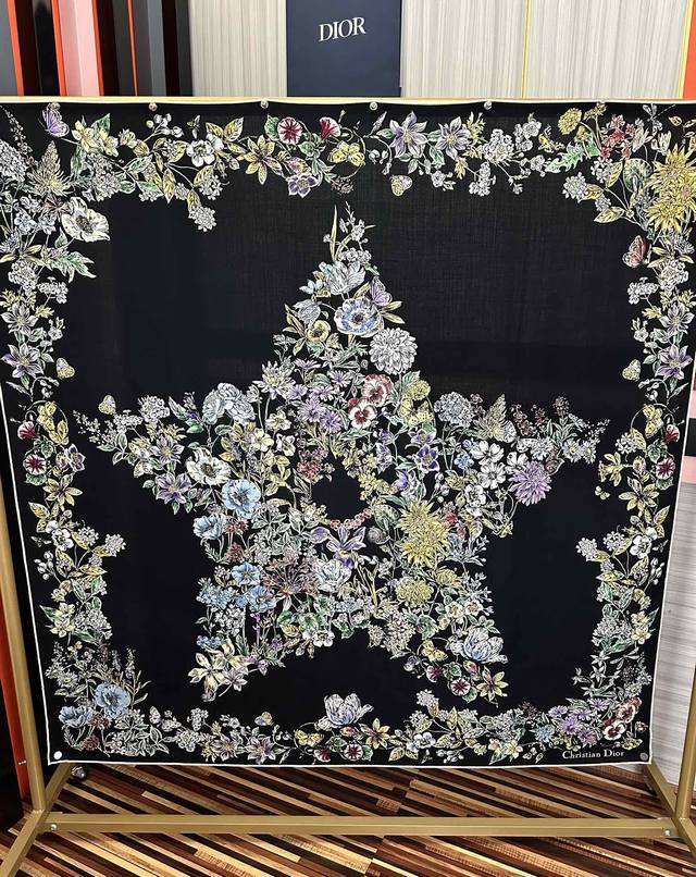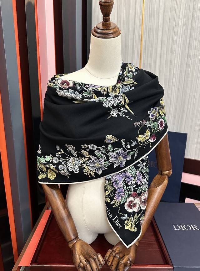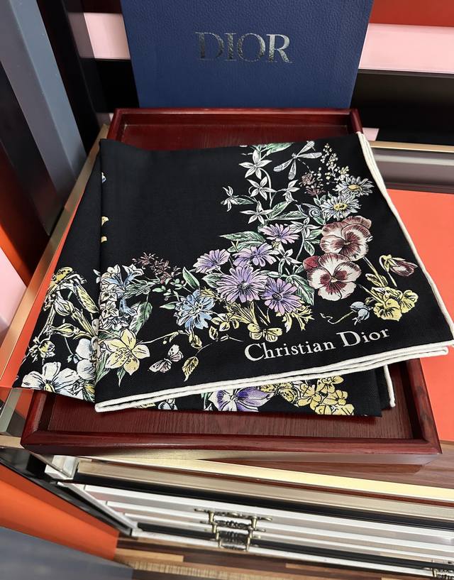 New Dior Double-Sided Silk and Wool Printed Handkerchief. This handkerchief features the Star pattern, representing Dior's lucky charm. Reinterpreted through the collection's exquisite floral theme, this lucky charm is meticulously crafted from silk and wool. The double-sided design features contrasting hand-rolled edges, both adorned with the Christian Dior logo for a sophisticated touch. It can be worn around the neck or as a headscarf for a modern look. Double-sided, same color Dior Star pattern. Contrasting hand-rolled edges. Size: 140 x 140 cm. Material: 30% silk, 70% wool, 3 colors.