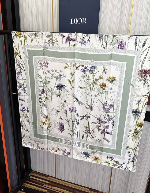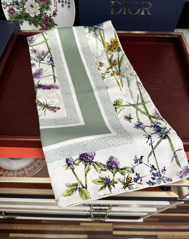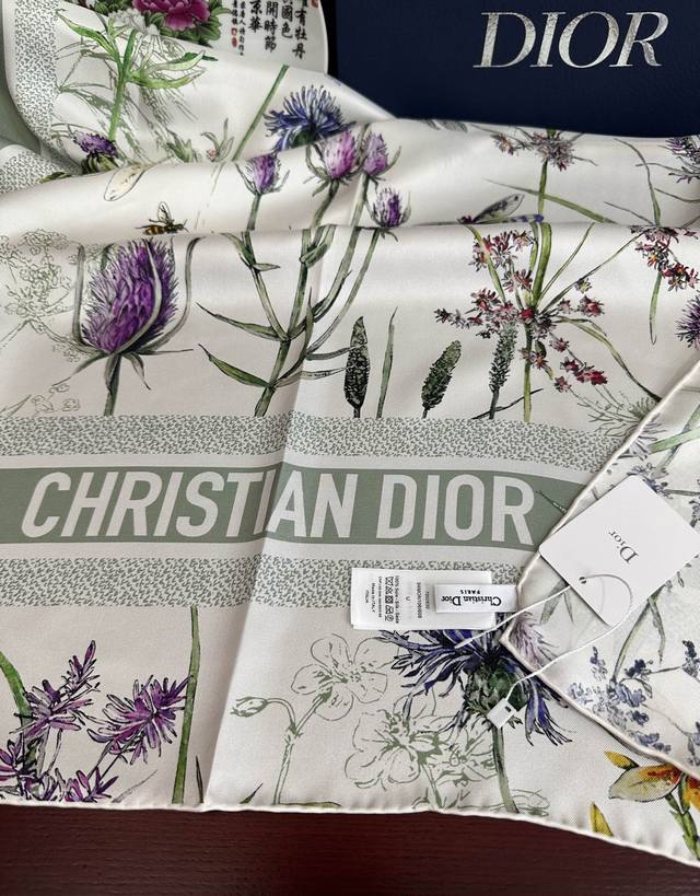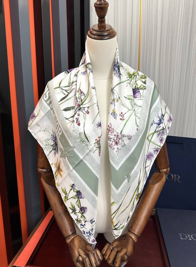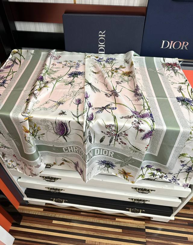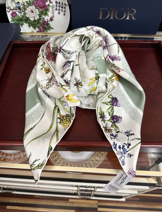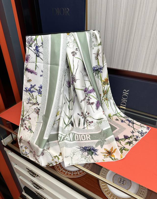 This high-quality Dior scarf is so beautiful! A new spring/summer 2025 design. It's gorgeous! Everyone who bought it raves about it. You have to be quick to grab it! A high-end, must-have for women. Extremely rare! Suitable for all seasons. Truly beautiful and incredibly alluring. The effect when worn is simply stunning. The quality is perfect. This scarf gives you an aura of sophistication while being exquisitely beautiful. Definitely a must-have! You'll be glad you made the right choice as soon as you receive it. Material: Silk. Size: 90x90 cm. Available in 2 colors.