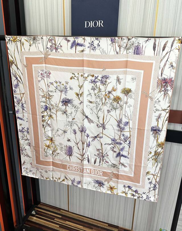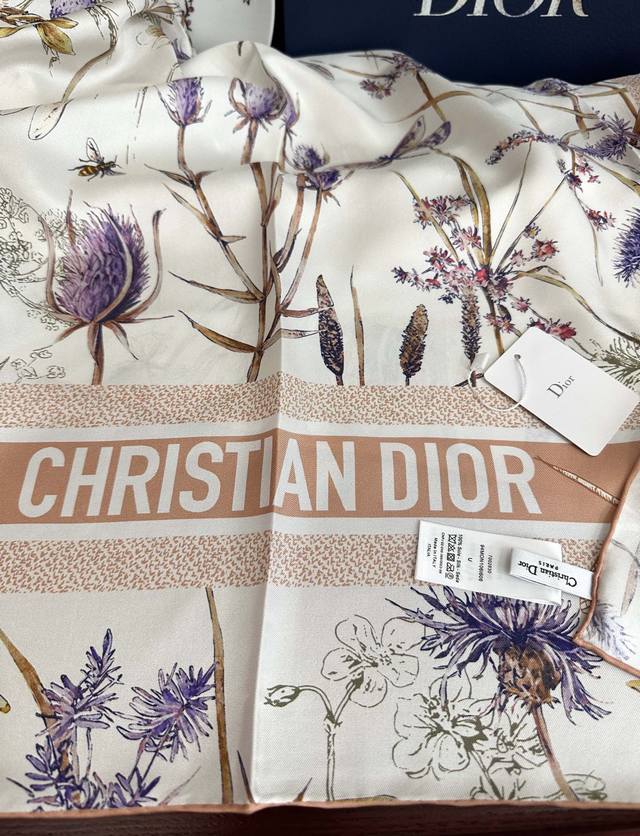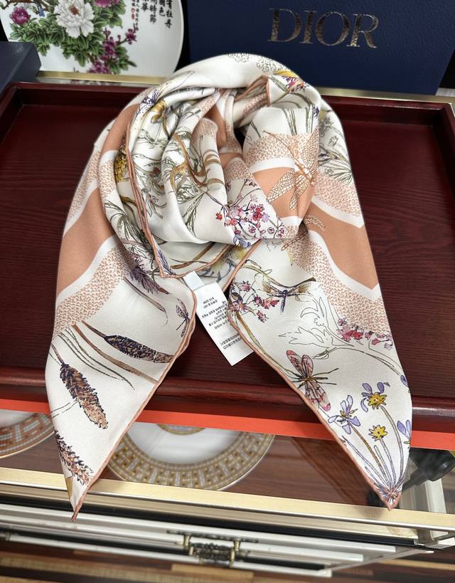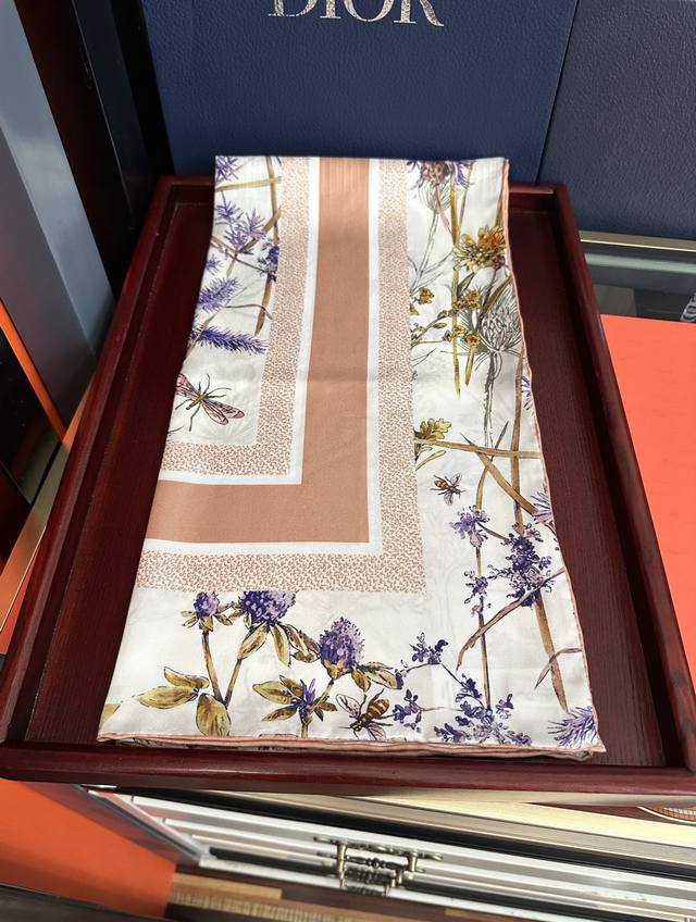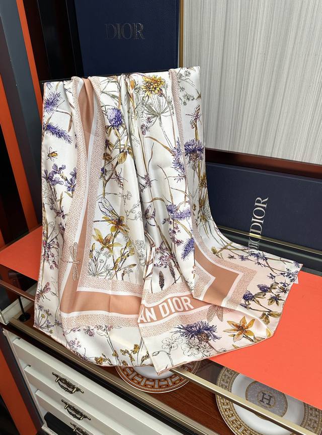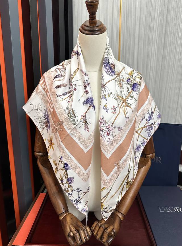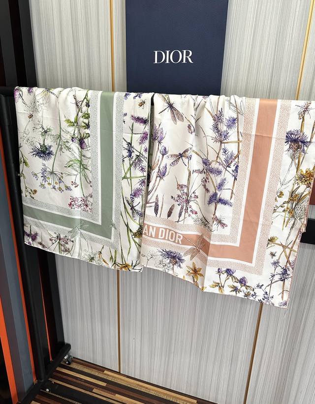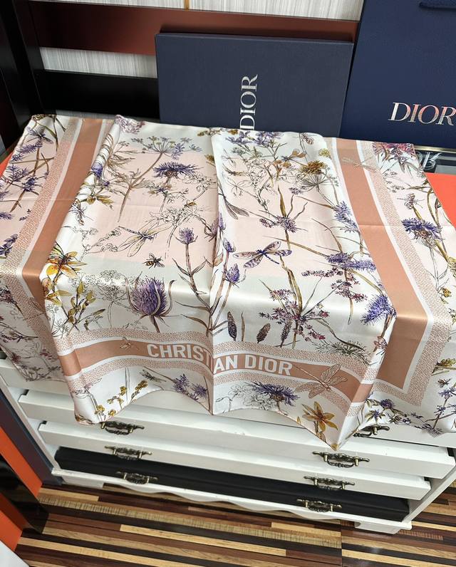 This high-quality Dior scarf is so beautiful! A new Spring/Summer 2025 design. It's gorgeous! Everyone who bought it raves about it. You have to be quick to grab it! A high-end, must-have for women. Extremely rare. Suitable for all seasons. Truly beautiful and incredibly alluring. The effect when worn is simply stunning. The quality is perfect. This scarf gives you an aura of sophistication while being exquisitely elegant. Definitely a must-have! You'll be glad you made the right choice as soon as you receive it. Material: Silk. Size: 90x90 cm. Available in 2 colors.