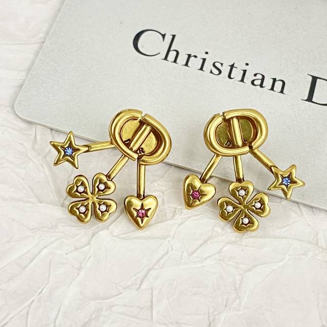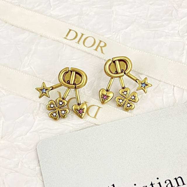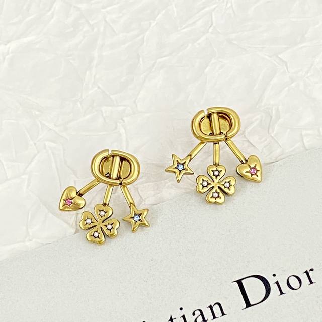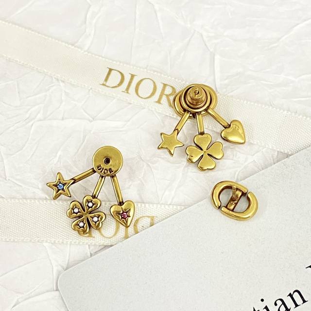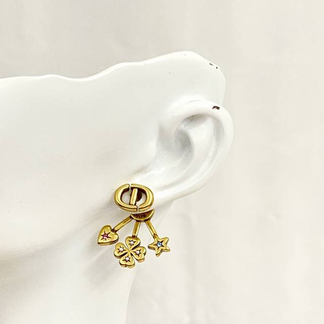 Dior's hottest earrings are now available! Dior's fan-shaped four-leaf clover earrings are meticulously crafted from vintage gold-finished metal. The multi-element, rear-mounted fan-shaped design is unique! The heart is adorned with pink crystals, the star with blue crystals, and the four-leaf clover with white resin beads.