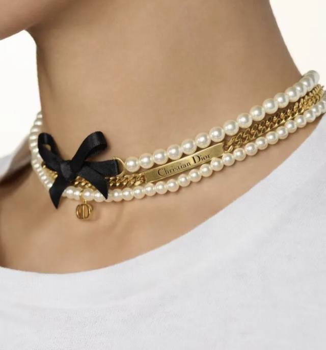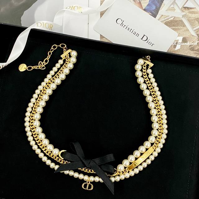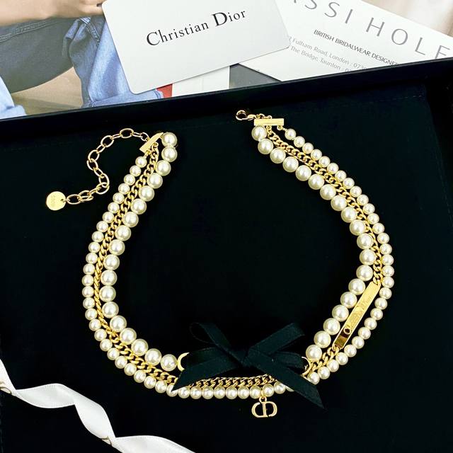 Code N982 Dior necklace, a hot-selling item, now available! Dior black bow three-layer pearl necklace. The pearls and chunky chain create a layered effect with the black bow hanging in the center. A divine combination reminiscent of Hepburn, gentle and sweet!