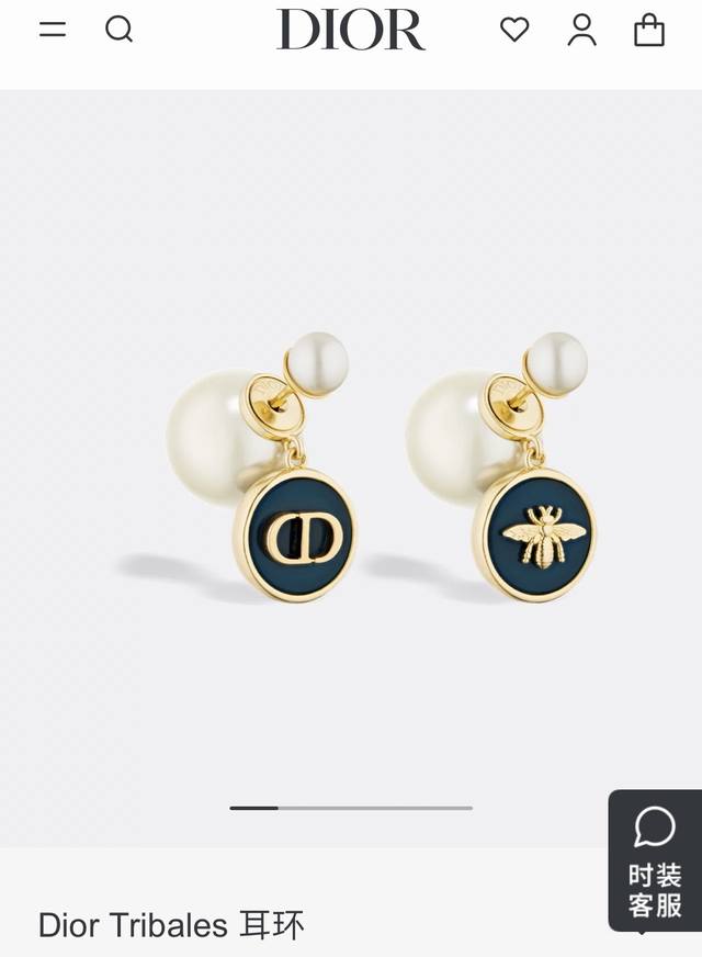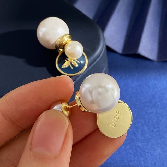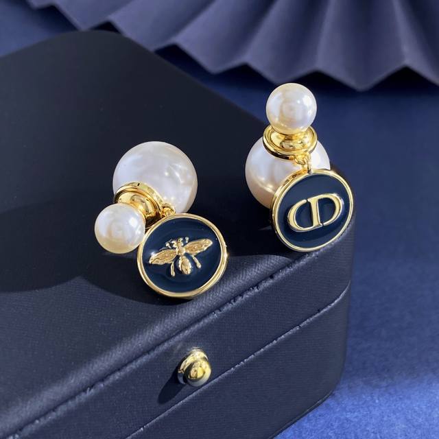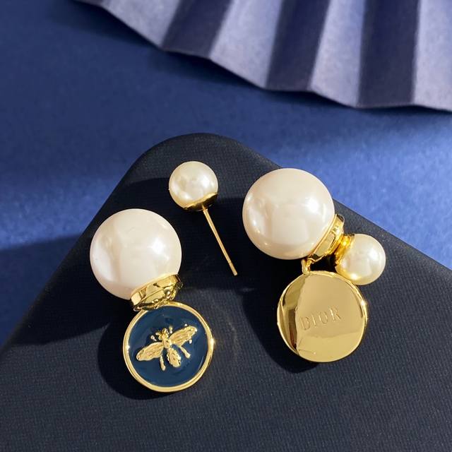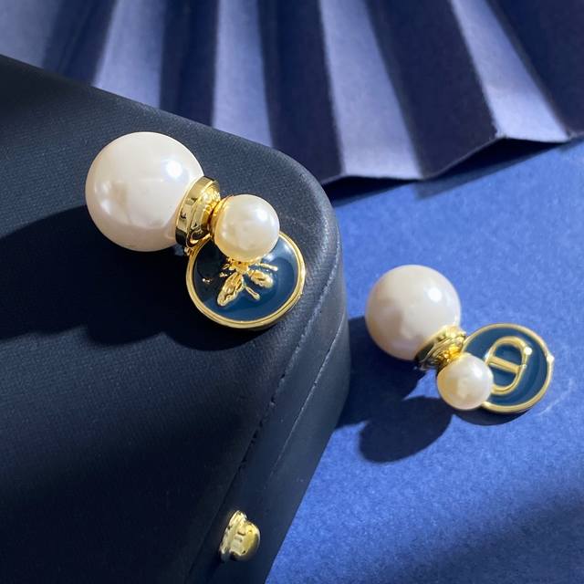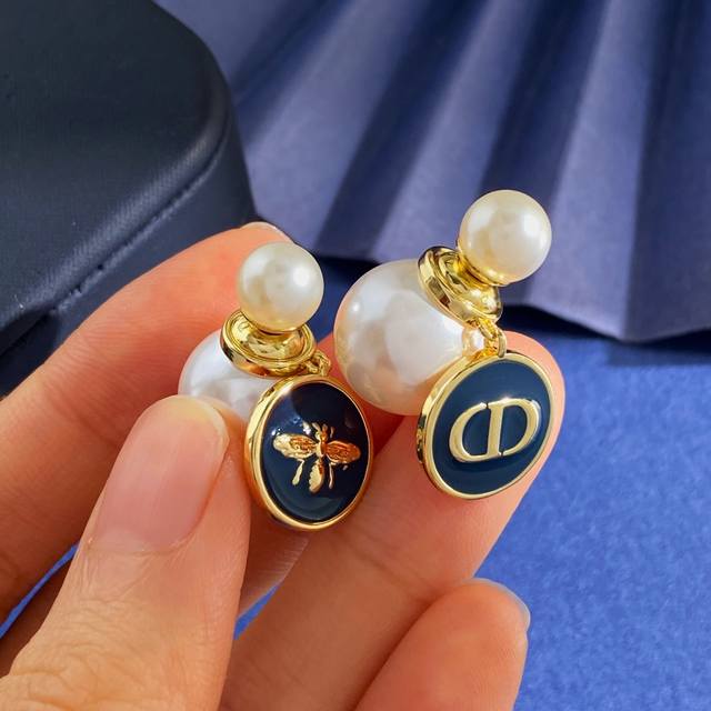 Dior new style high-end temperament fashion front and back hanging pearl pendant of different sizes navy blue ink blue oil drop round small bee Cd letter Ab with earrings earrings brass material gold weight about 10g total length about 2.65cm