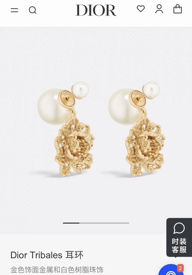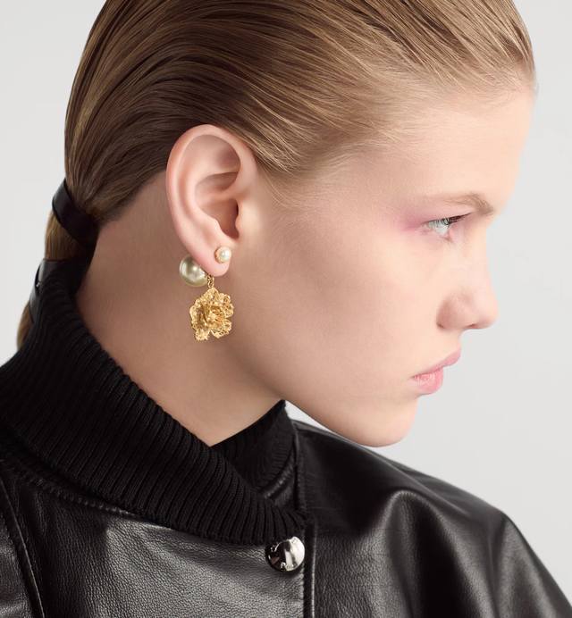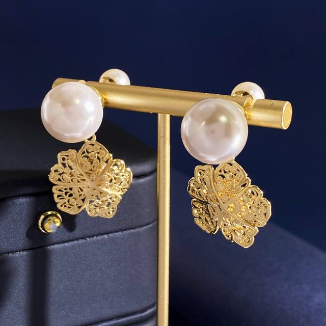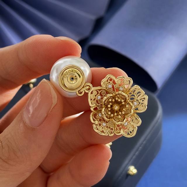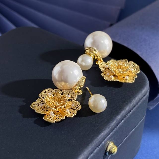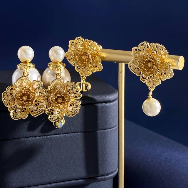 Dior High-End Fashionable Pendant Earrings with Large and Small Pearls, 3D Hollow Out Design, Inlaid with Small Pearls and Flowers, Made of Brass, Gold Color, Weight Approx. 10g, Total Height Approx. 3.7cm, Flower Size Approx. 2cm*2cm*0.5cm. (