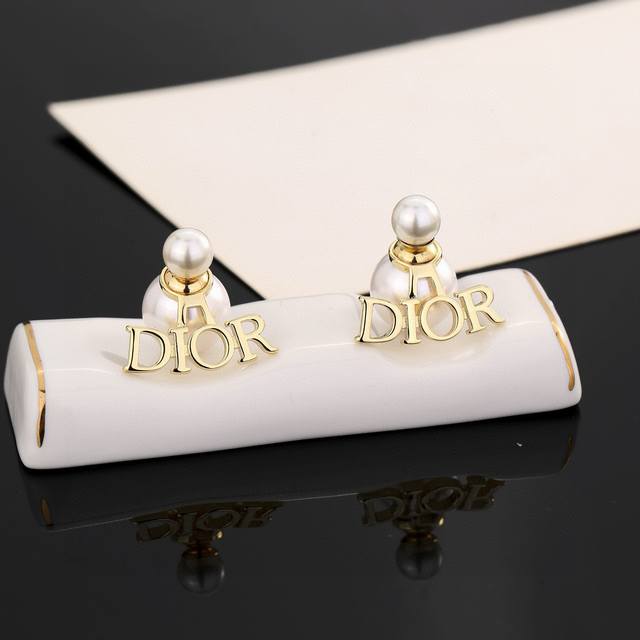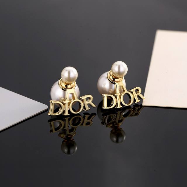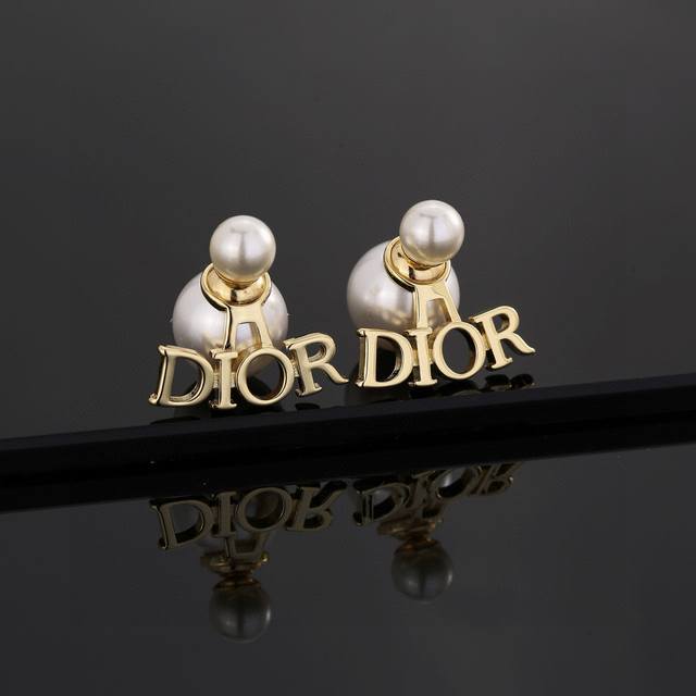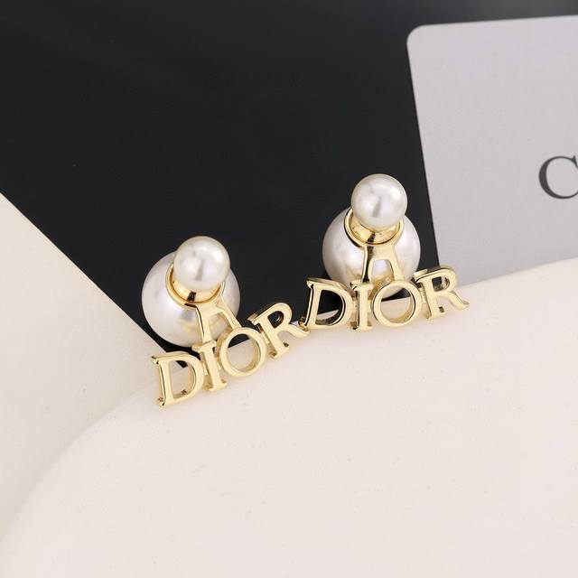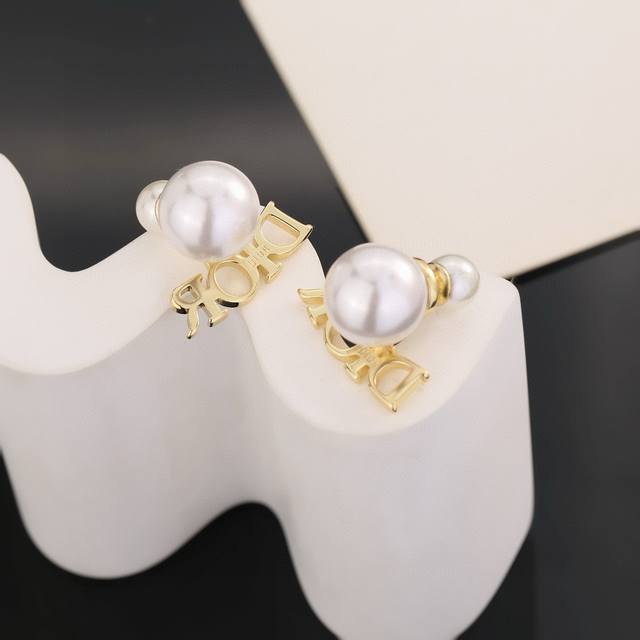 Dior Letter Cd Pearl Earrings. These Dior Tribales earrings offer a fresh take on Dior's iconic design. White resin beads suspend the silver-finished metal letter "DIOR," with the letter "O" set with crystals. These striking earrings can be paired with other styles.