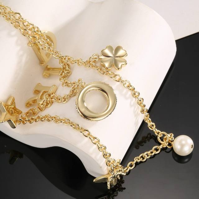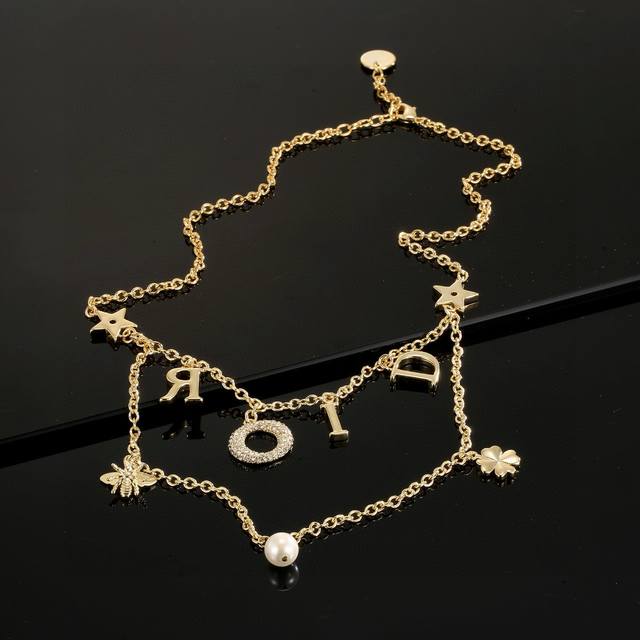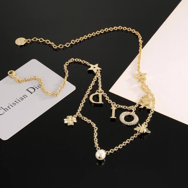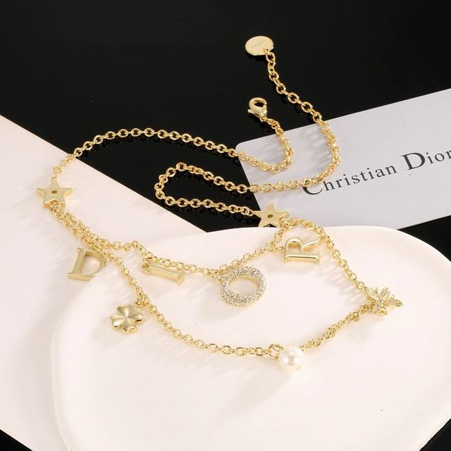 This Dior necklace is exquisite and elegant. The gold-plated metal chain is adorned with the "DIOR" lettering, each letter set with multicolored crystals, adding an elegant touch and embellishing the look, making your wrist sparkle. The gold-plated metal has a sophisticated vintage feel. The length is automatically adjustable to fit different wrist sizes, and the lobster clasp makes it easy to wear. A perfect accessory for any fairy! Get yours now! (Necklace ID: