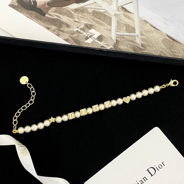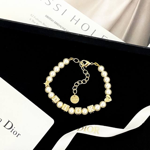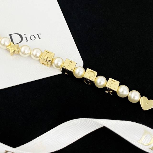Dior Light Gold Multi-Element Small Square Letter Pearl Bracelet