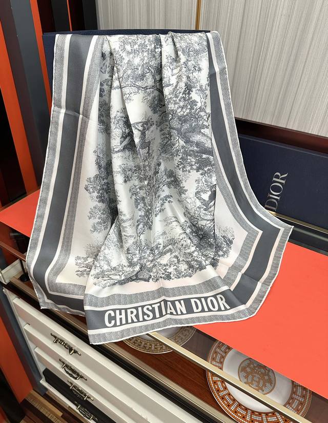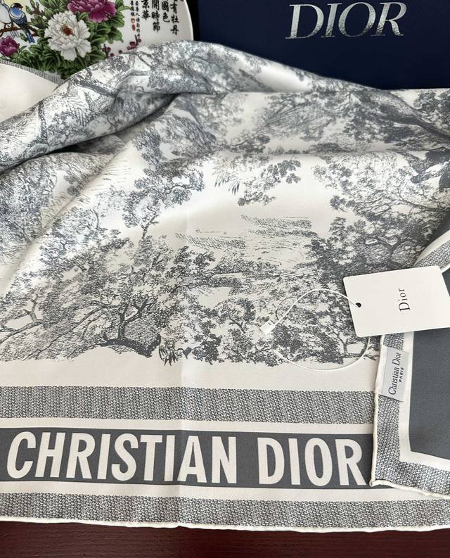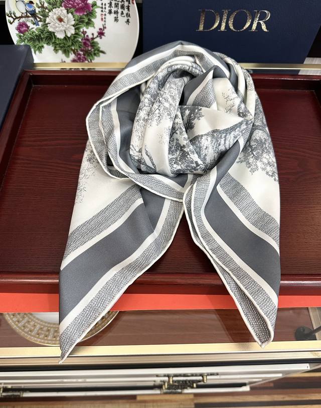 Dior Printed Square Scarf 2025 18 momme Reversible Tonal Sauvage Print This square scarf features the classic Sauvage print and is crafted from ivory and grey mulberry silk twill. It is finished with hand-rolled edges and adorned with contrasting "Christian Dior" logo jacquard stripes. It can be tied around the neck or used as a headscarf. [smile] A more refined Dior look. Ivory and grey Sauvage print. Contrasting logo stripes. Hand-rolled edges. [lips] Size: 90x90 cm. Material: 100% silk, 3 colors.