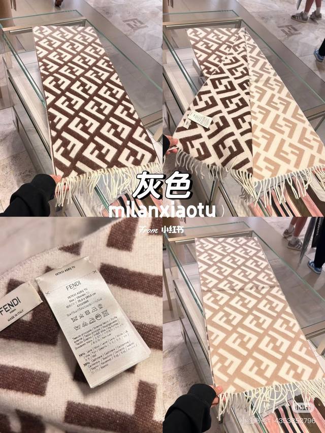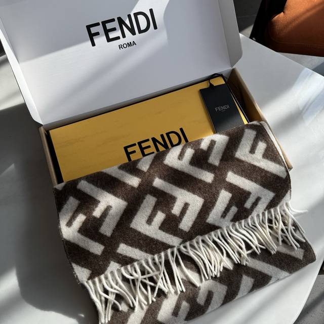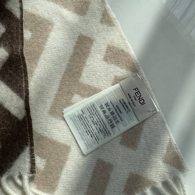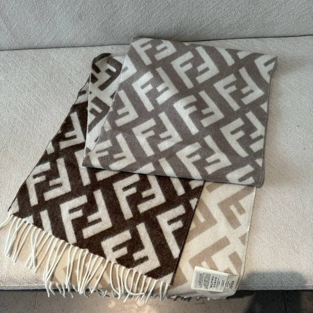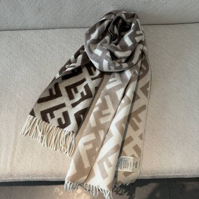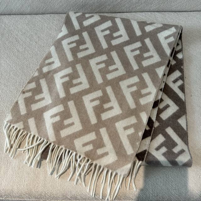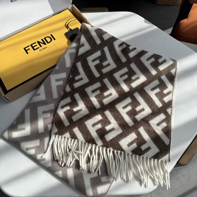 Fendi monogram gradient double-sided cashmere scarf, soft and delicate double-sided style, Ff classic jacquard gradient; soft cashmere material. From the Stefano Pilati collaboration design series. The gradient effect transitions from brown to beige, decorated with an oversized white Ff pattern. Super gentle and elegant, full of high-end feel, original quality. A stunning design you shouldn't miss. Specifications: 35 x 180 cm, tassel length 8 cm x 2, material 100% lambswool, long tassel scarf, soft and skin-friendly.