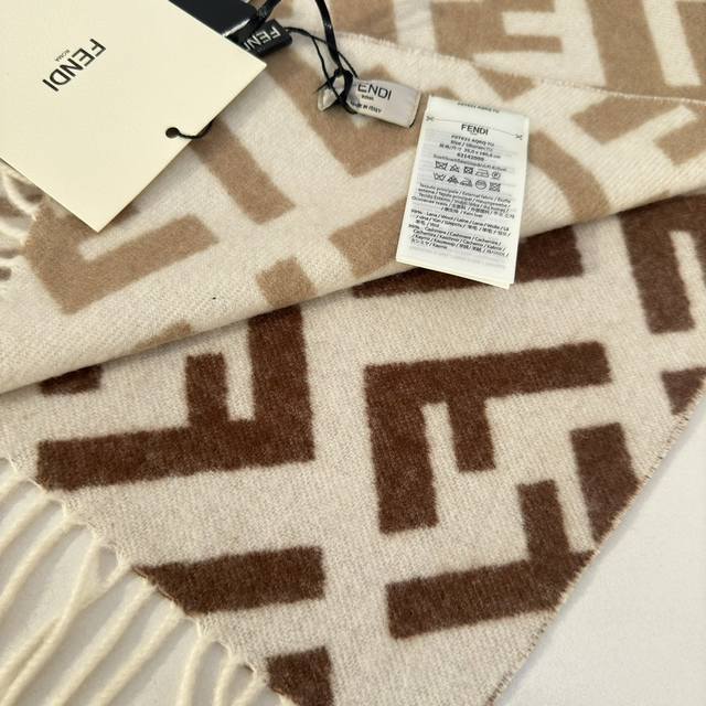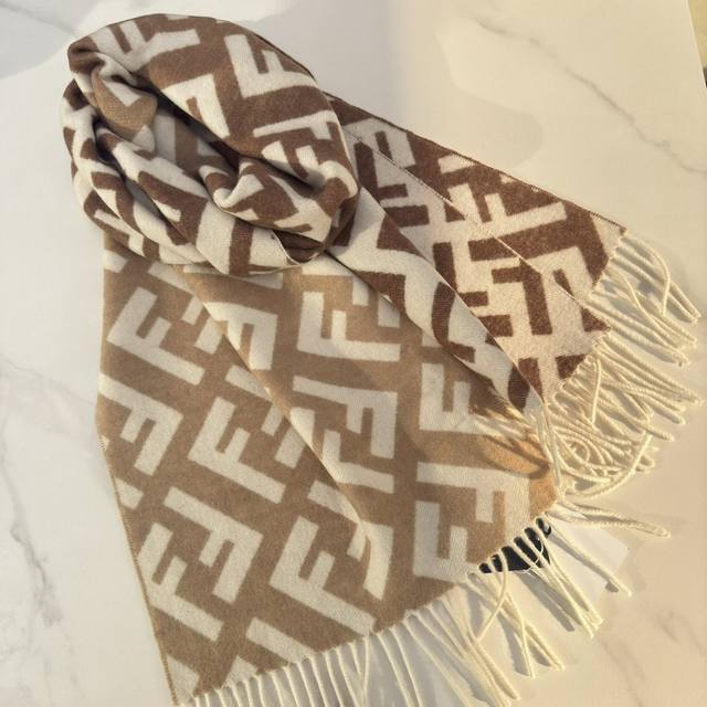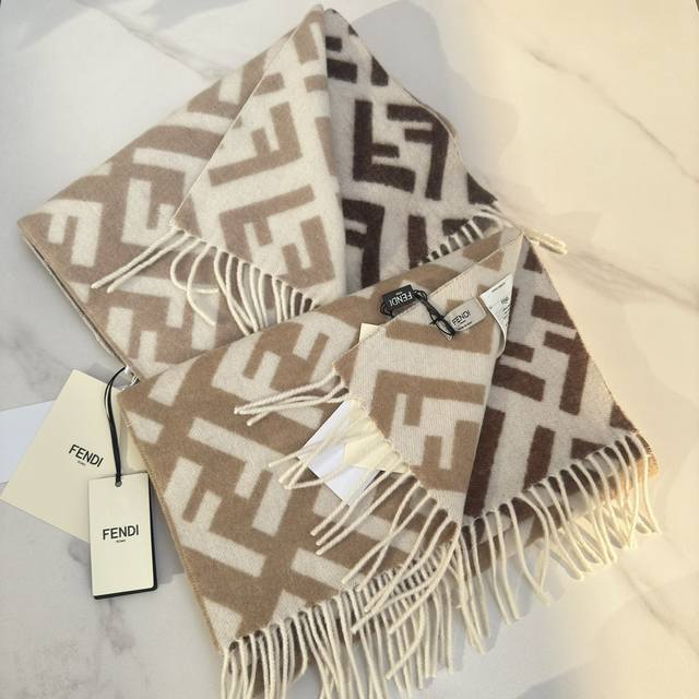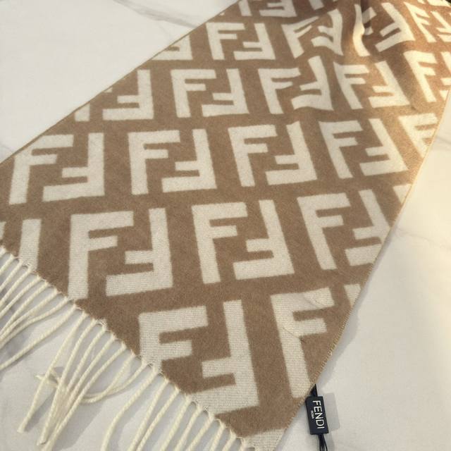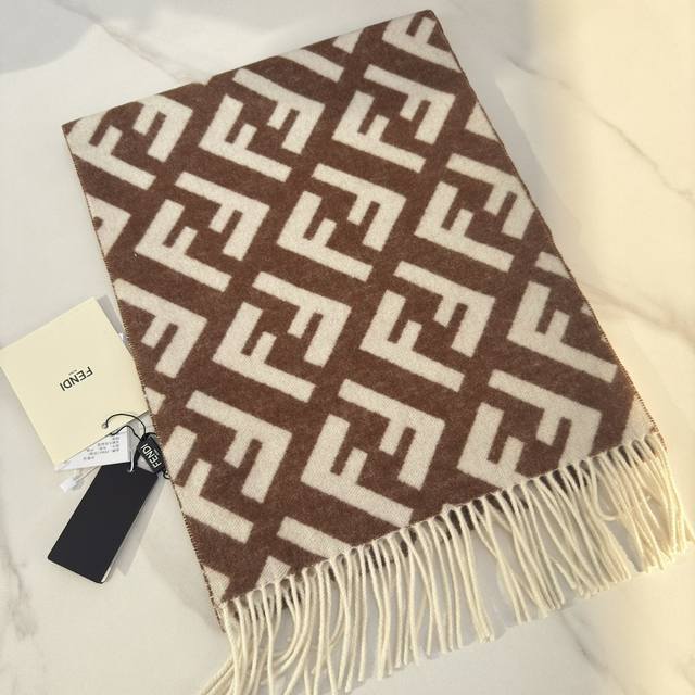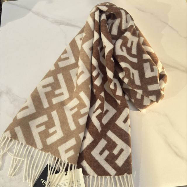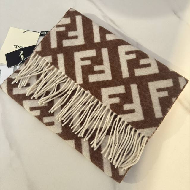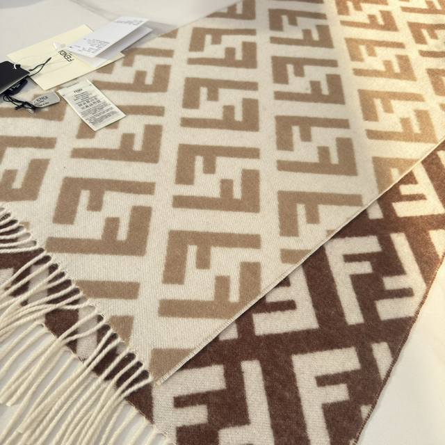 Fendi's new monogram gradient double-sided cashmere scarf features a soft and delicate double-sided design with a classic Ff jacquard gradient; crafted from soft wool and cashmere. From the Stefano Pilati collaboration collection, the gradient effect transitions from brown to beige, accented with an all-over, oversized Ff motif in white. This ultra-soft and elegant scarf exudes a luxurious feel, and is made of genuine original quality. Don't miss this stunning design. Specifications: 35cm x 1cm, 8cm x 2cm tassel length, made from cashmere and wool. This long scarf with tassels is soft and skin-friendly.